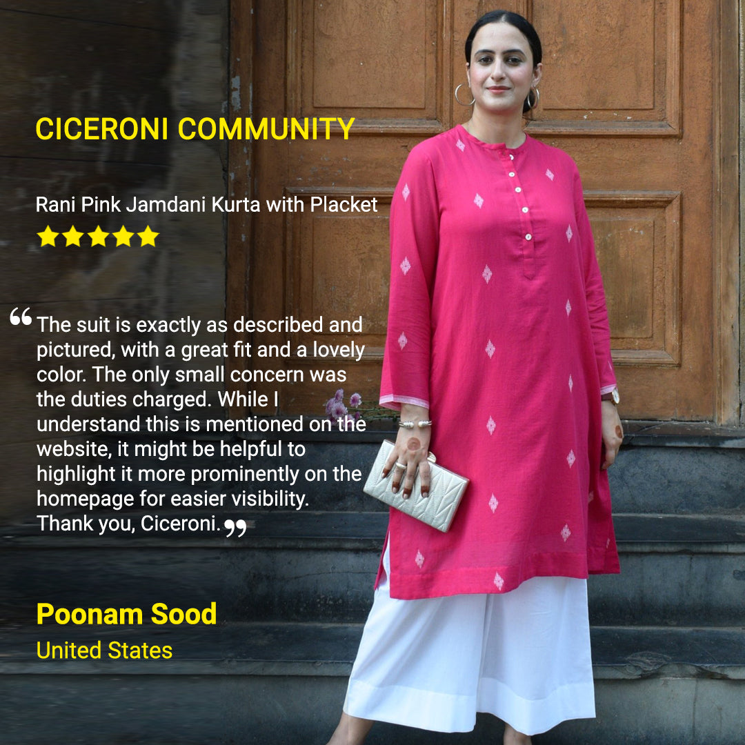 Shop hassle-free on Ciceroni and save time. In case of any issues, you can get in touch with our customer care number or write to us on hello@ciceroni.in for size customizations, delivery timelines and or urgent deliveries, material specifications or just styling and shopping guidance. We ship globally across the world. In case you do not see your country at the check-out, write to us and we will help you further. We are just a call and message away for your pleasurable shopping experience.