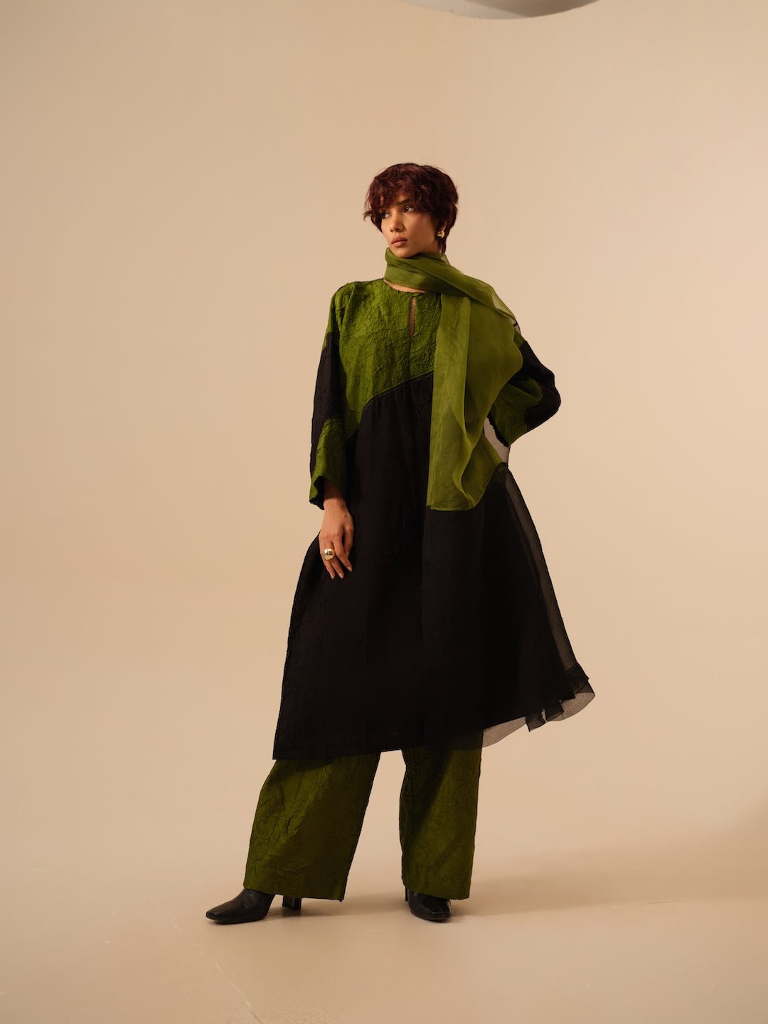 A lightweight dupatta crafted in sheer organza, featuring bold color blocking that adds depth and contrast. The translucent fabric drapes gracefully, offering a modern interpretation of a classic accessory. Designed to pair effortlessly with both structured and fluid silhouettes.