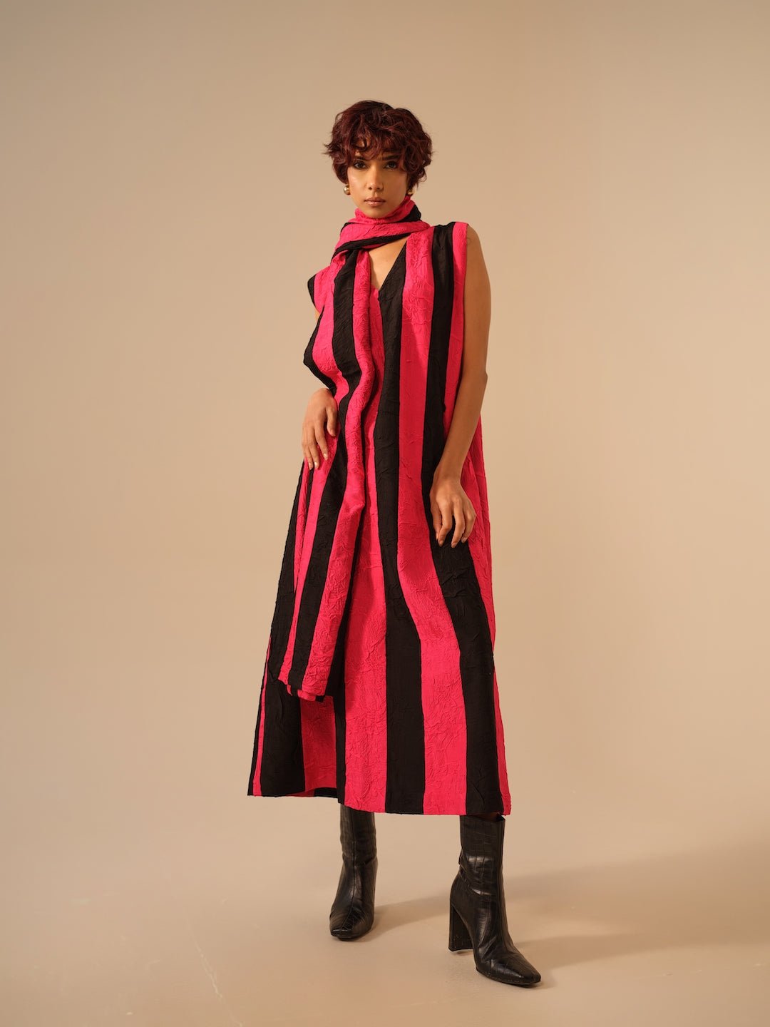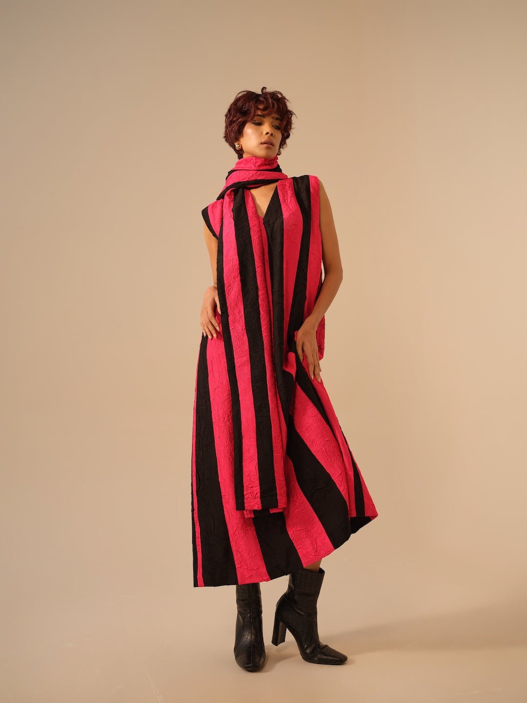 A two-and-a-half-meter-long scarf crafted in hand-crushed silk, created in-house by our team of artisans. The piece features vertical patchwork detailing that echoes the textures and rhythm of our twin dress. Lightweight yet tactile, it drapes effortlessly adding depth and elegance to any ensemble.