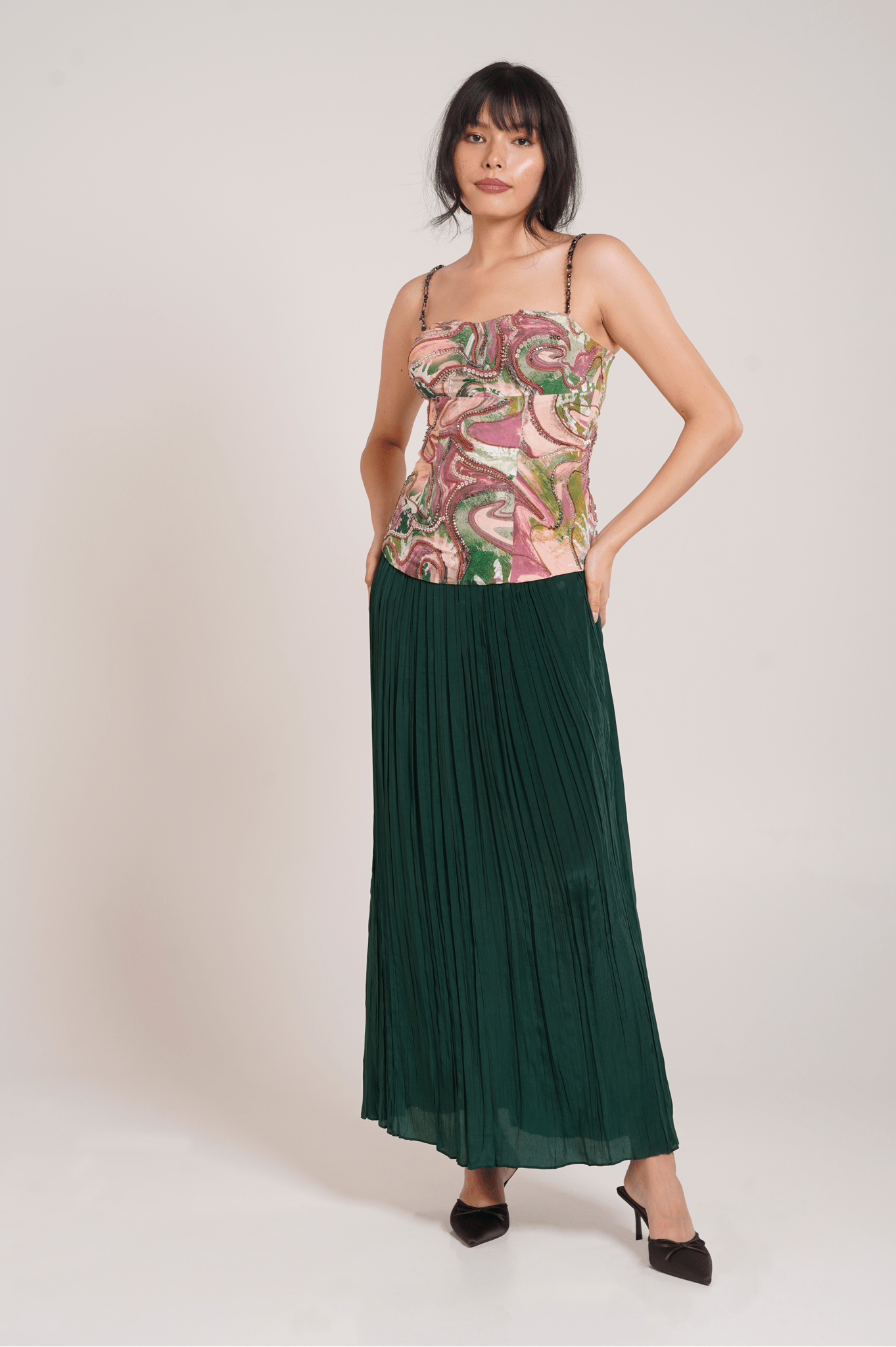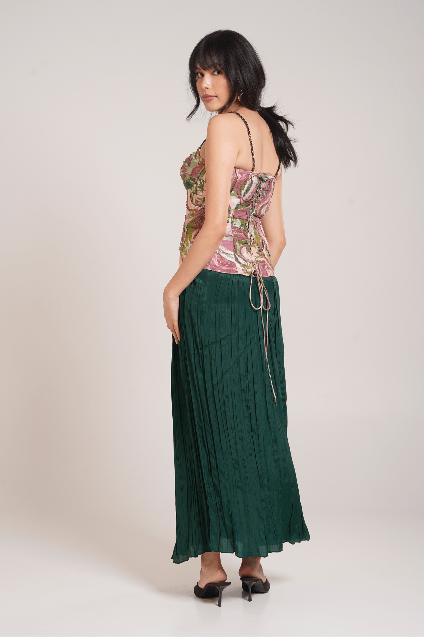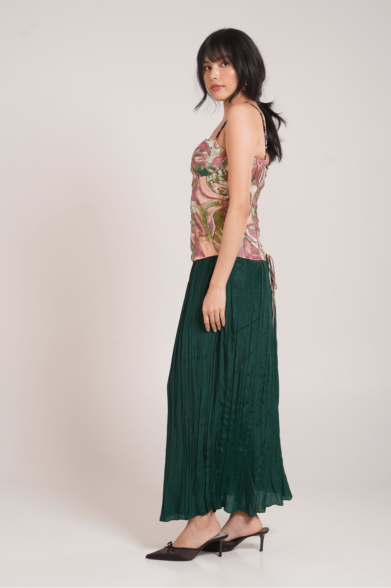 The Ira Set features a fitted embroidered corset with beaded straps and structured boning, paired with a flowing forest green pleated maxi skirt.