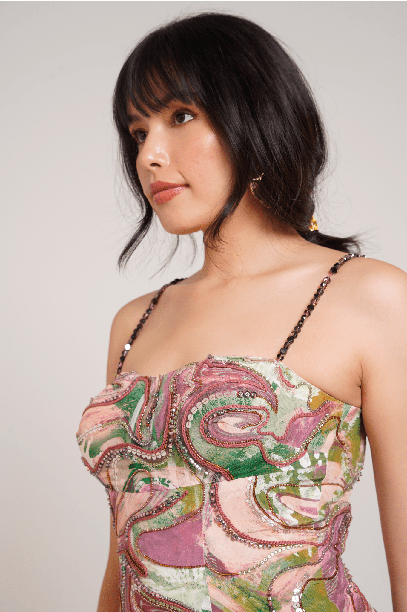 The Ira Set presents a sophisticated ensemble with a fitted embroidered corset featuring delicate beaded straps and structured boning that sculpts the silhouette with precision. Paired with a flowing forest green pleated maxi skirt, this set masterfully blends intricate textural craftsmanship with elegant fluidity. Perfect for festive evenings or statement occasions, the Ira Set offers a striking balance of refined artistry and graceful movement, ensuring a memorable and sophisticated presence.