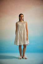 The Miyabi Dress is an ode to detail and delicacy. Crafted in hand screenprinted striped Chanderi, it features intricate ruching along the body that creates soft gathers, allowing the fabric to fall with graceful fluidity. Delicate appliqué work at the hem and scattered across the body adds gentle texture, while a back keyhole closure offers a refined finishing touch. Miyabi is a piece that speaks in soft, sophisticated tones — timeless, elegant, and endlessly versatile.