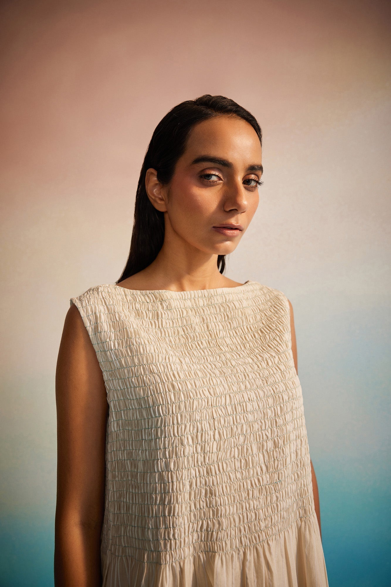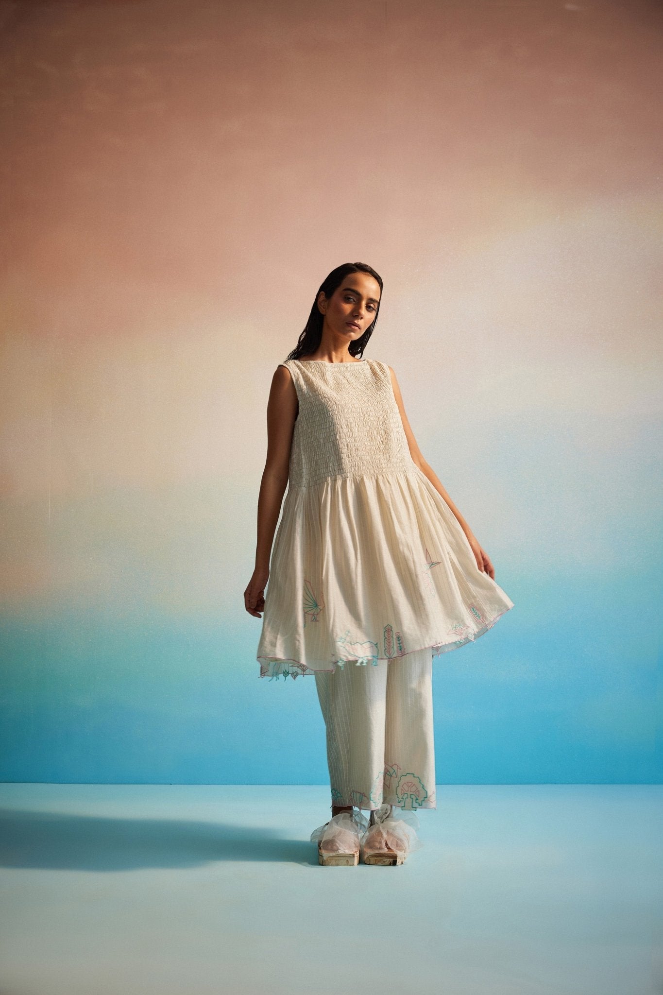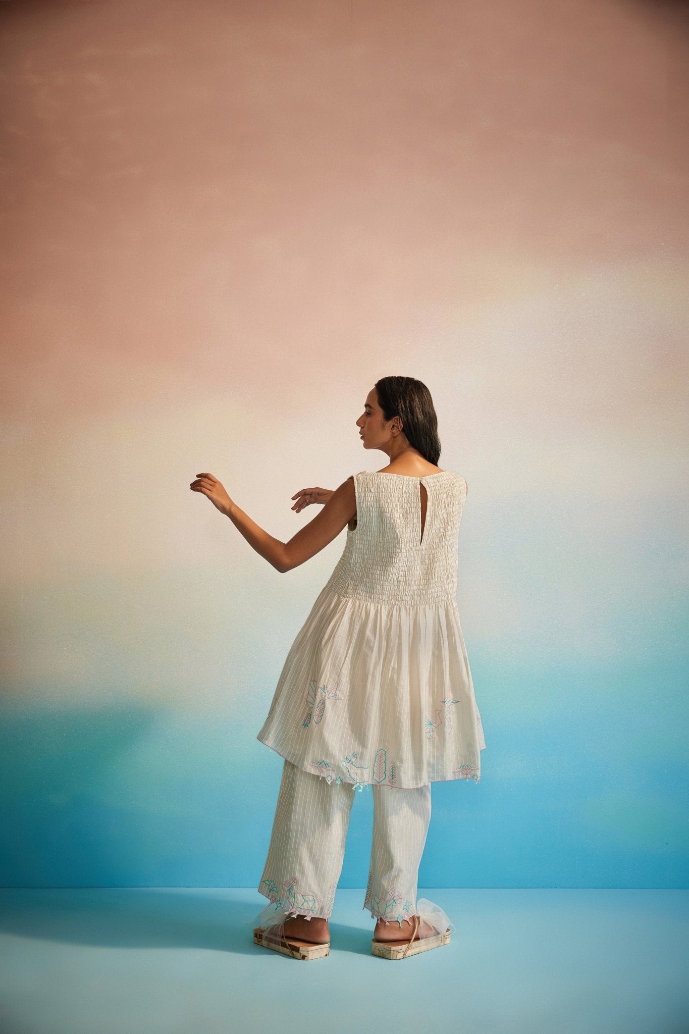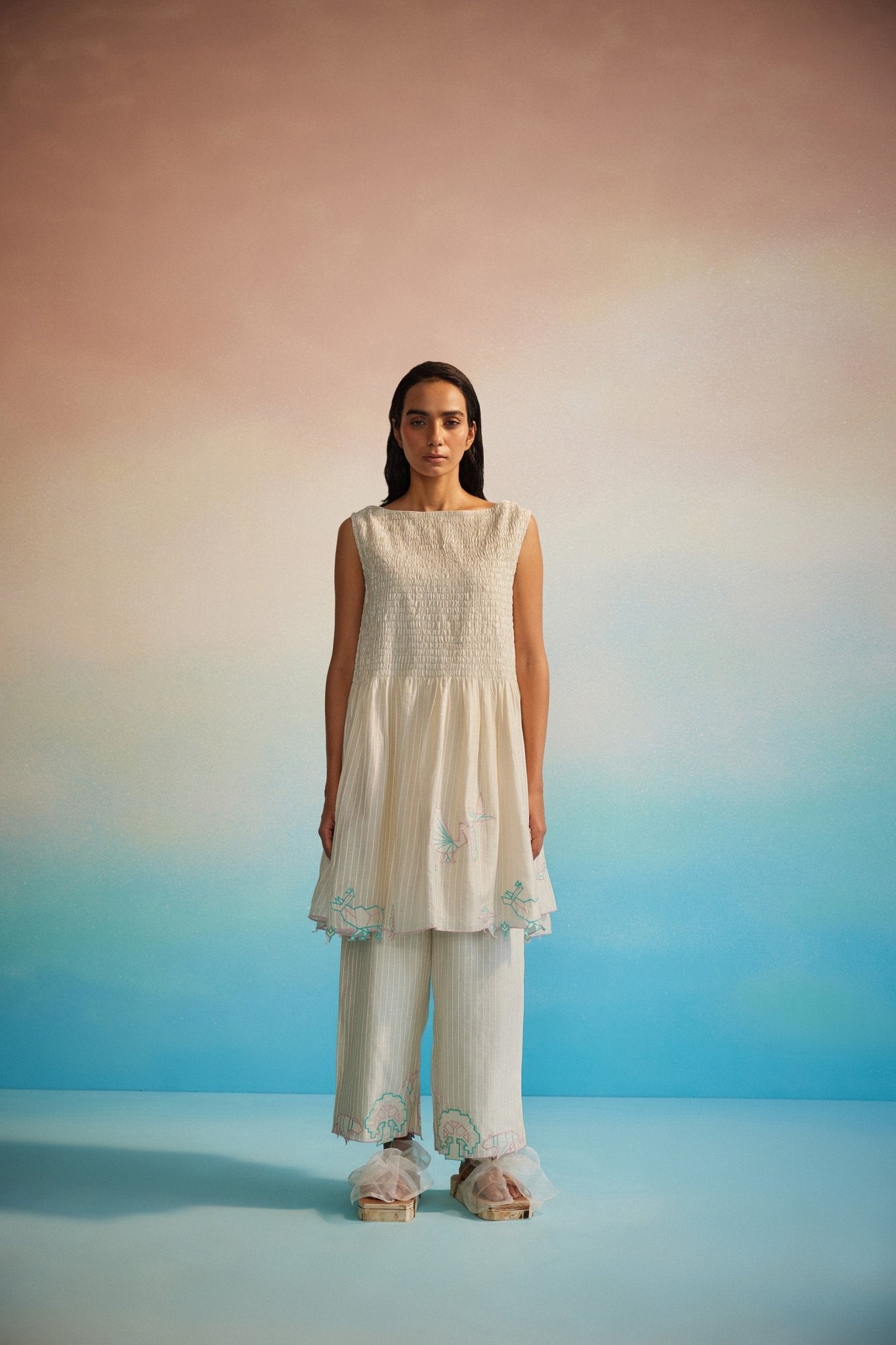 The Miyabi Ruching Dress features soft ruching, delicate appliqué, and a graceful drape in striped Chanderi. Styled with the Shiori appliqué Pants, finished with subtle embroidery and a relaxed fit, this set blends texture and refinement in an effortlessly elevated silhouette.