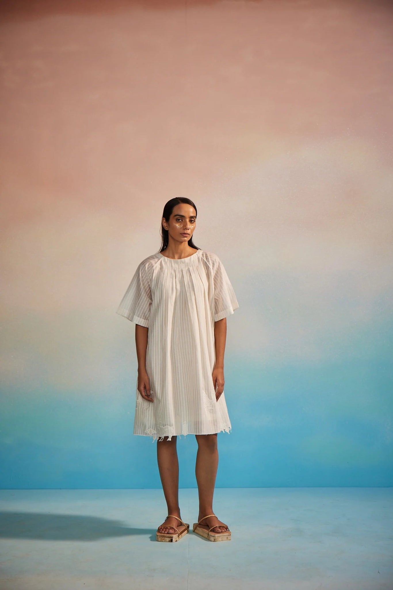 Crafted from breathable, hand screenprinted Chanderi, the Orihome Dress is designed to offer both comfort and elegance. Its lightweight fabric drapes perfectly on the body, making it ideal for everyday wear. The dress features crisp box pleats at the front and back, adding subtle volume and movement. Delicate appliqué embroidery adorns the sleeves and hem. A seamless blend of structure and artistry, the Orihime Box Pleat Kurta is a timeless piece that elevates your everyday wardrobe with effortless grace.