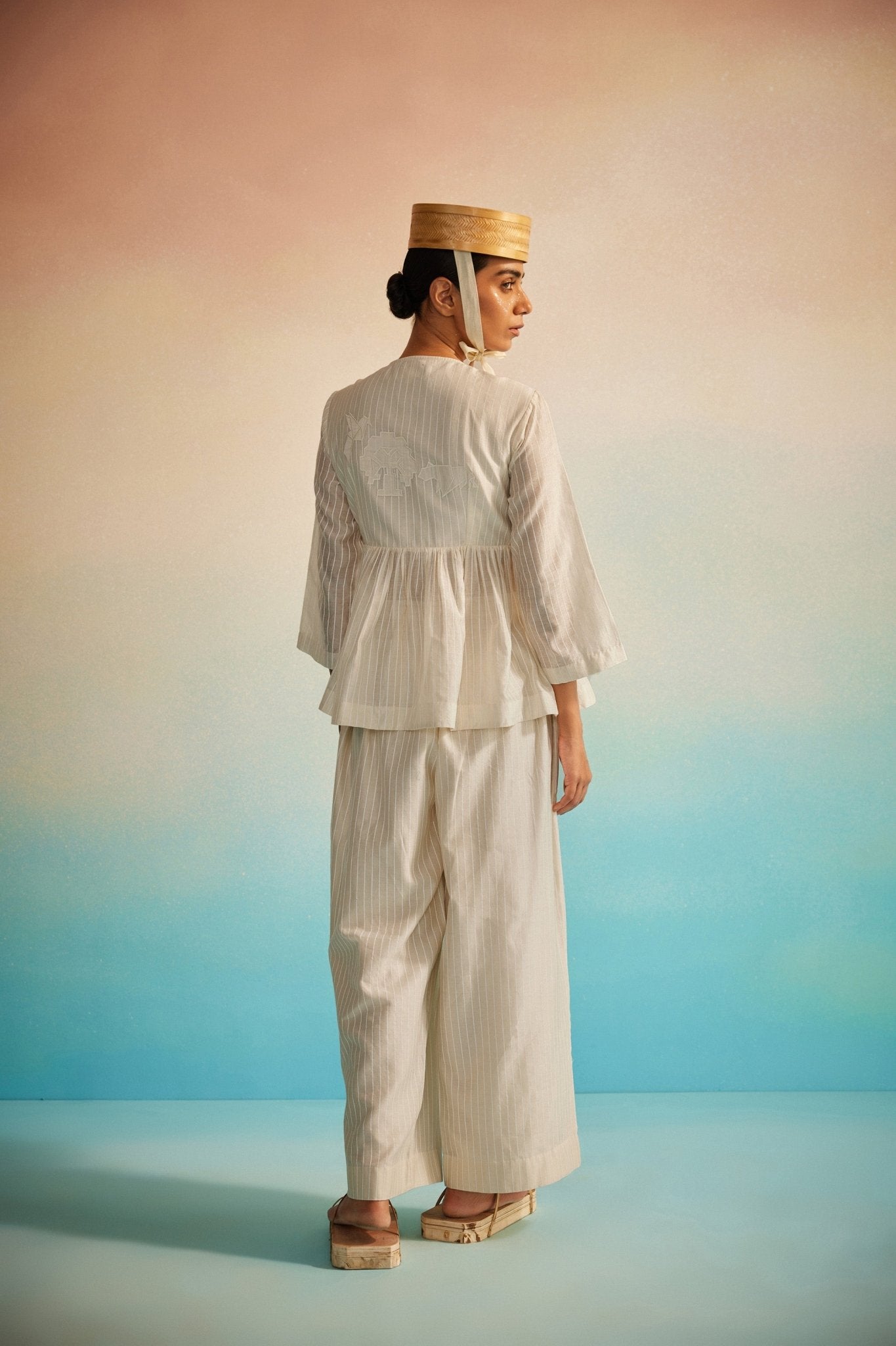 A playful yet refined set featuring the Tabaneru Angrakhi in hand screenprinted Chanderi, detailed with 3D origami flowers and an appliquéd back yoke. Paired with Hama Akari Stripe Pants, the set flows with lightness and charm — perfect for thoughtful everyday dressing.
