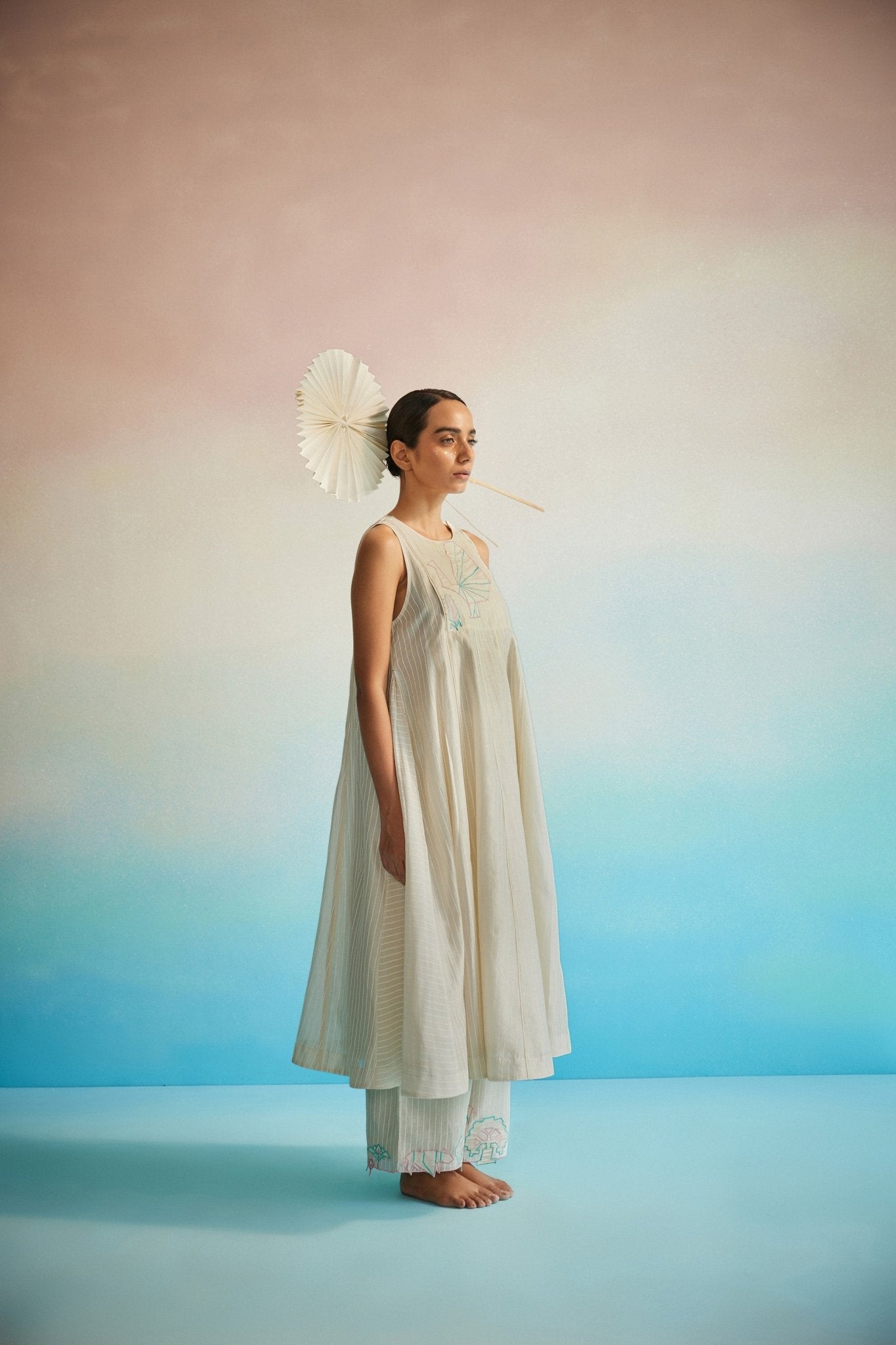 A gentle play of structure and fluidity, the Utsuroi Halter Dress features screenprinted details, appliqué on the yoke, and soft pleating. Paired with the Shiori appliqué Pants, finished with subtle embroidery and a relaxed drawstring waist, this set moves with quiet elegance and ease.