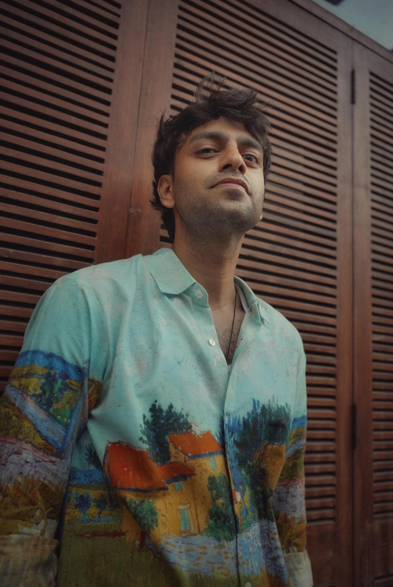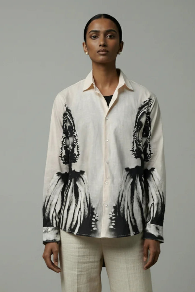 - Shirt has regular collar, full sleeves and front button closure