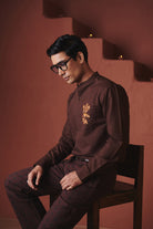 Coffee Co-Linen Men's Band Collar Shirt – Slim Fit Tailored in a sleek slim cut; this linen shirt features a distinctive band collar and an eye-catching vertical floral embroidery panel down the front. The design masterfully merges festive elegance with contemporary tailoring, making it equally suited for formal occasions or refined casual wear. Pair with tailored trousers for an effortlessly polished look that transitions seamlessly from day to evening.