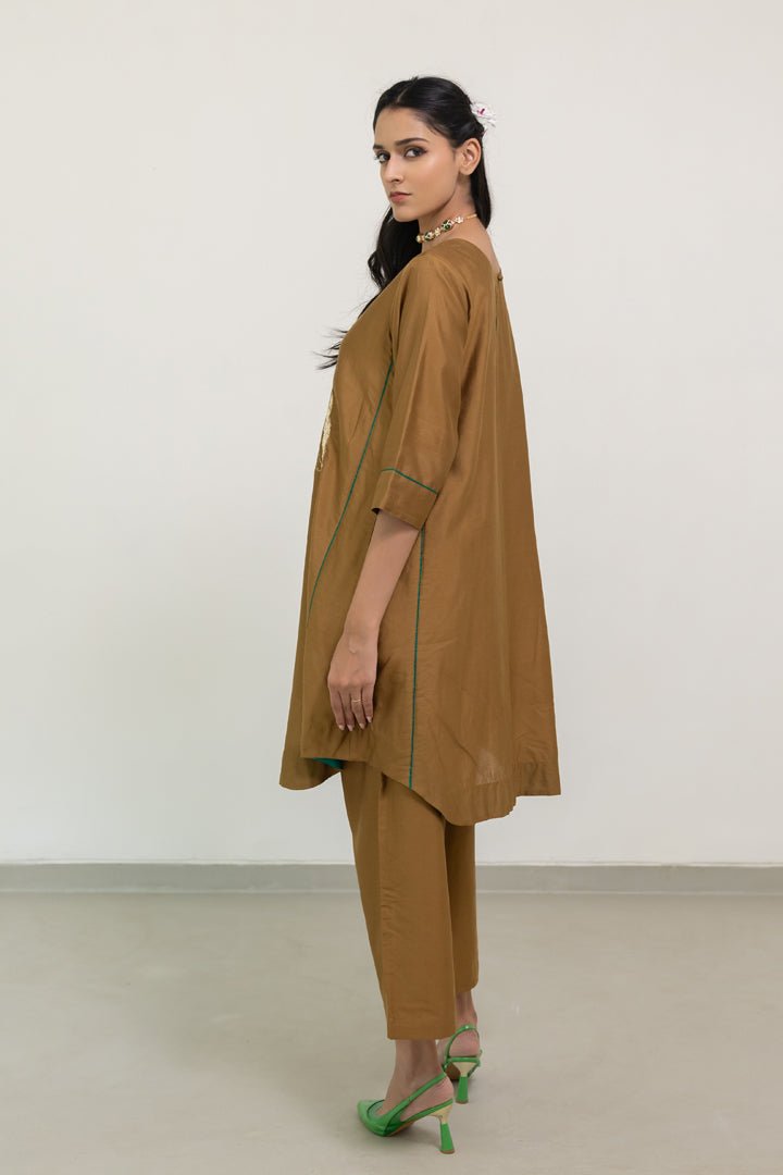 The top is adorned with intricate pitta Zari work in shimmering gold, complemented by contrast green . French knots that add a vibrant touch. Paired with pants, this set effortlessly blends tradition and modernity. Tunic and pants are fully lined with cotton mulmul fabric