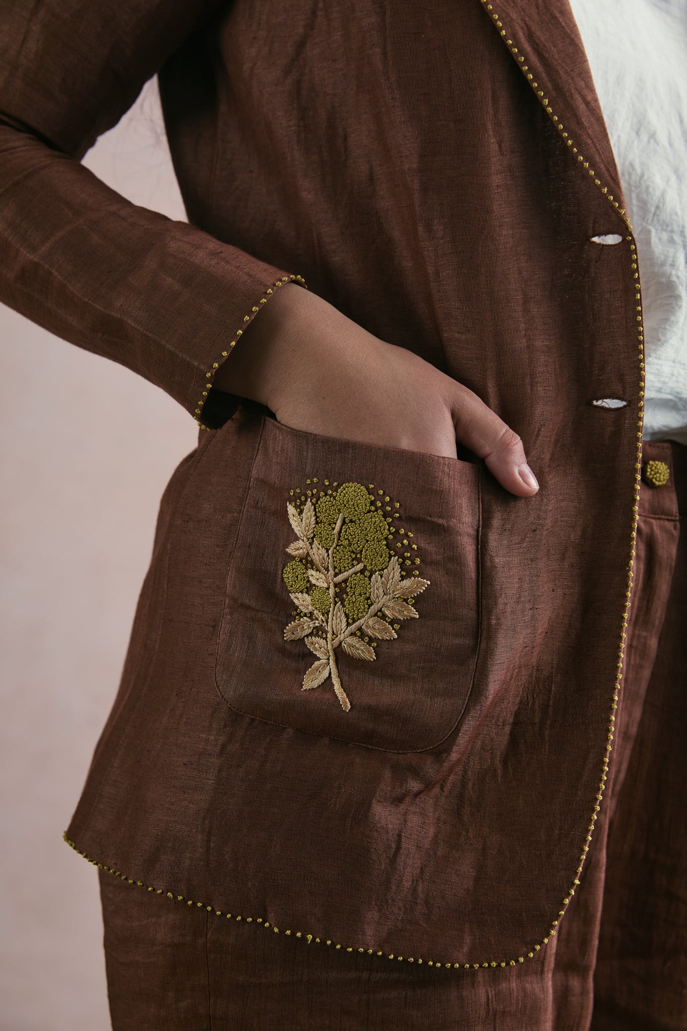 Discover understated elegance with our Celestial Co-ord set in rich brown. This curated ensemble features a handwoven linen-silk blazer adorned with intricate hand-embroidered details gracing the pockets, edges, and collar—a testament to traditional craftsmanship reimagined for the modern wardrobe. Complemented by relaxed-fit trousers with subtle embroidered accents, this set effortlessly merges tailored structure with comfortable ease. An investment piece that transcends seasons, perfect for those who appreciate refined style rooted in artisanal heritage.