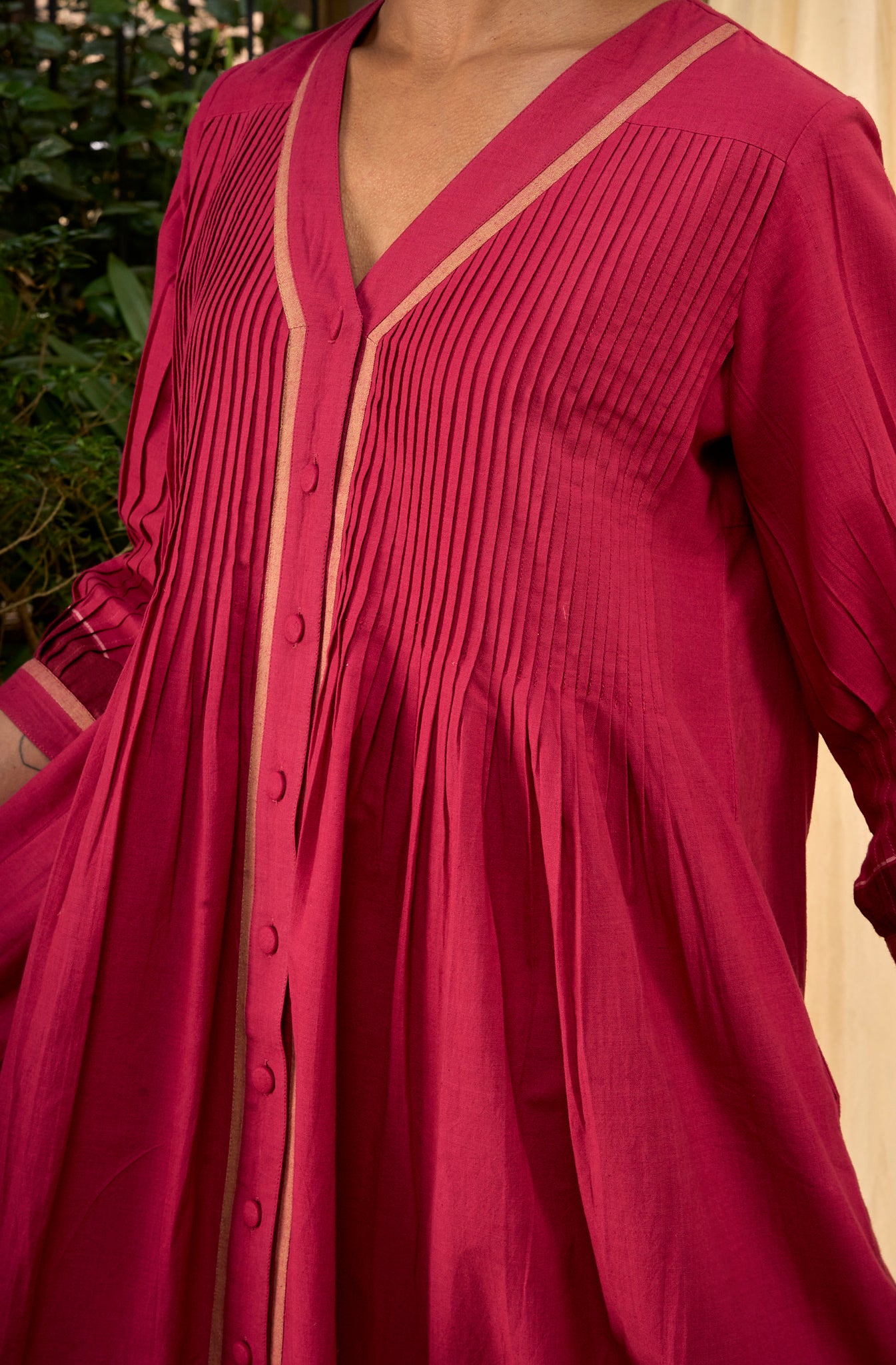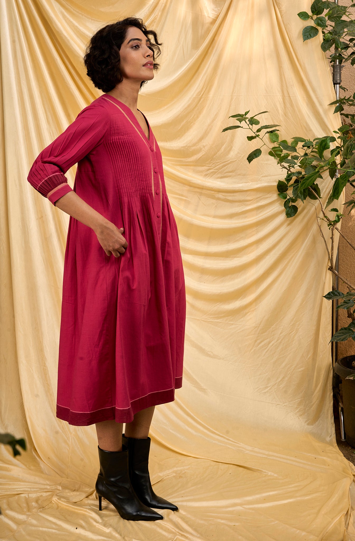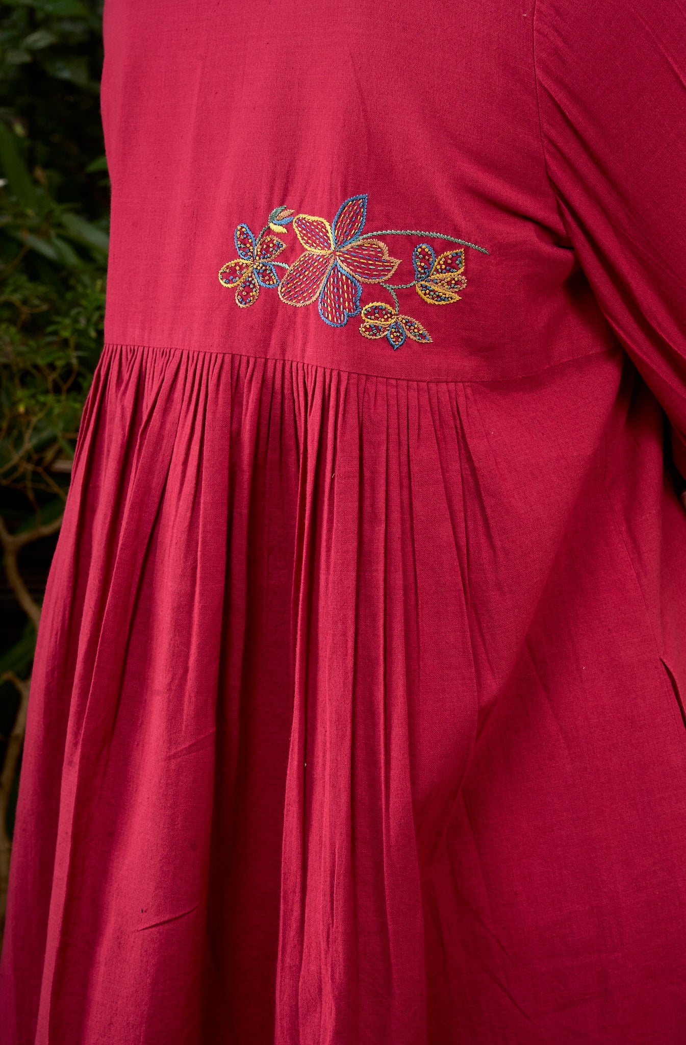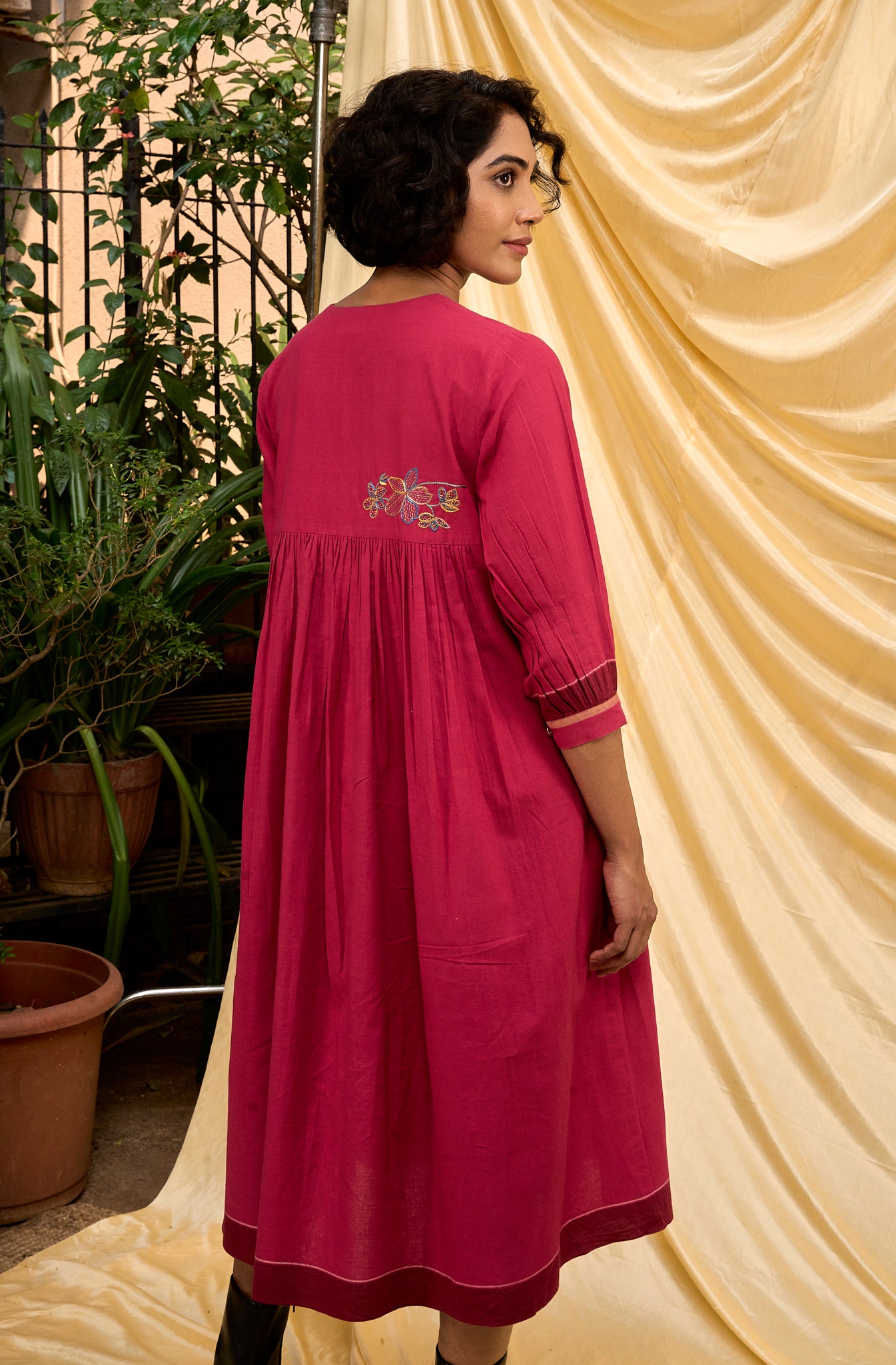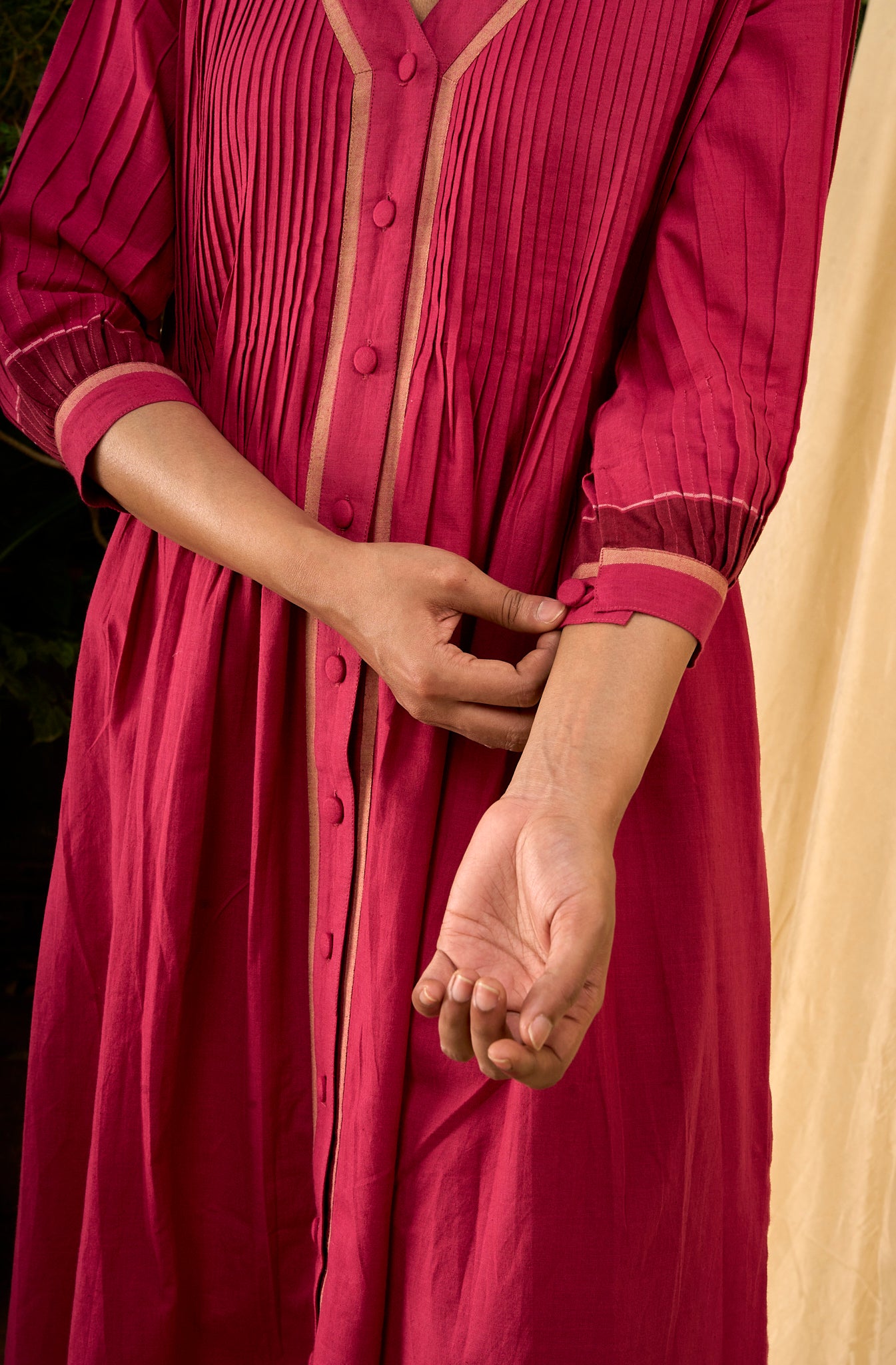 This pleated dress is a refined expression of ease and understated elegance. Crafted from breathable handwoven cotton, it features neatly placed pleats along the front and sleeves, creating a silhouette that feels both structured and fluid. Subtle contrast selvedge detailing adds depth and a quiet, artisanal character. The gathered back is finished with a delicate embroidered floral motif, lending a soft, handcrafted charm to the piece. Designed with a front button-down closure, it offers versatile styling, wear it as a dress or layer it as a lightweight jacket.