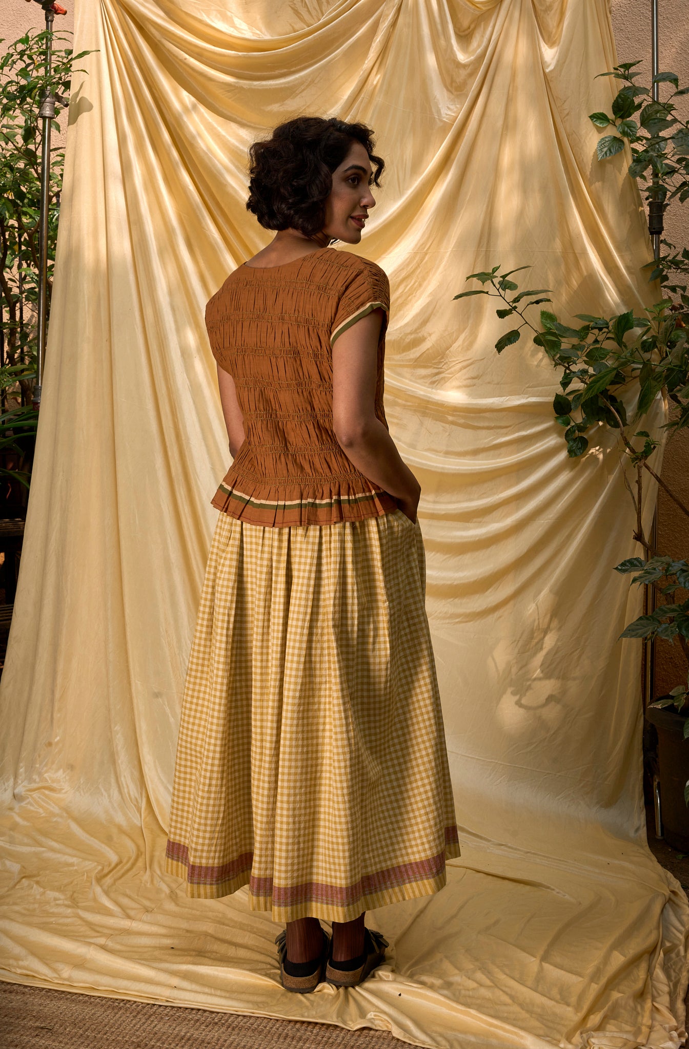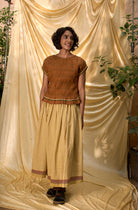 This gathered skirt is a refined expression of effortless movement and everyday elegance. Crafted from breathable handwoven cotton, it features a softly gathered silhouette that flows with ease while offering all-day comfort. Designed with a structured belt waistband, it brings a touch of definition to the fluid form, while side pockets add practical functionality. Finished with a contrasting brown selvedge at the hem, the piece carries a subtle artisanal detail.