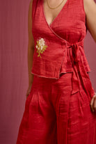 Embrace contemporary elegance with this artisanal co-ord set. The wrap-around crop top in handwoven linen-silk drapes with effortless sophistication, while wide-legged pleated trousers provide graceful movement. Intricate hand-embroidered details adorning the sides and front elevate the ensemble, marrying refined craftsmanship with understated ease. A versatile piece that celebrates traditional weaving techniques through a modern lens.