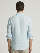 Crafted from 60 Lea European linen, this breathable ice blue shirt offers a refined yet effortless look. Designed with a button down collar, full sleeves, barrel cuffs, and a curved hem, it transitions easily from casual to smart-casual wear. Handmade and timeless, it only gets softer with every wash.