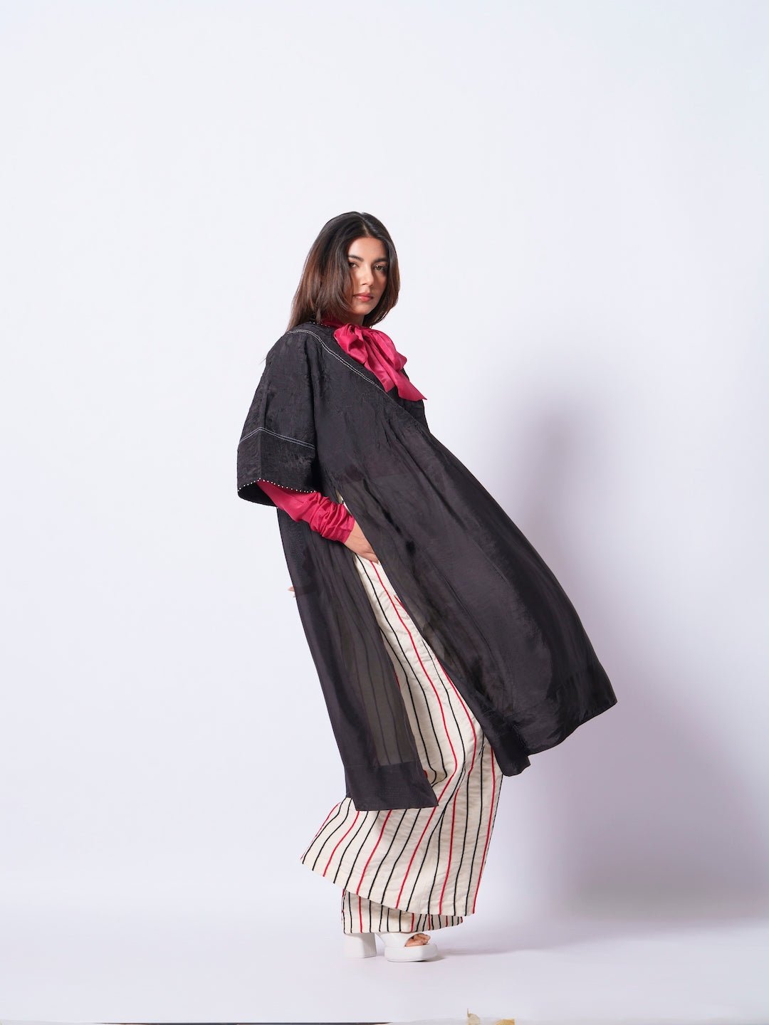 Relaxed and oversized, these trousers are made from handwoven cotton featuring a delicate wet-plaid texture. Accented with hand-stitched cording in a bold contrast, they embody a balance of effortless elegance and thoughtful design, combining fluidity with grounded sophistication.