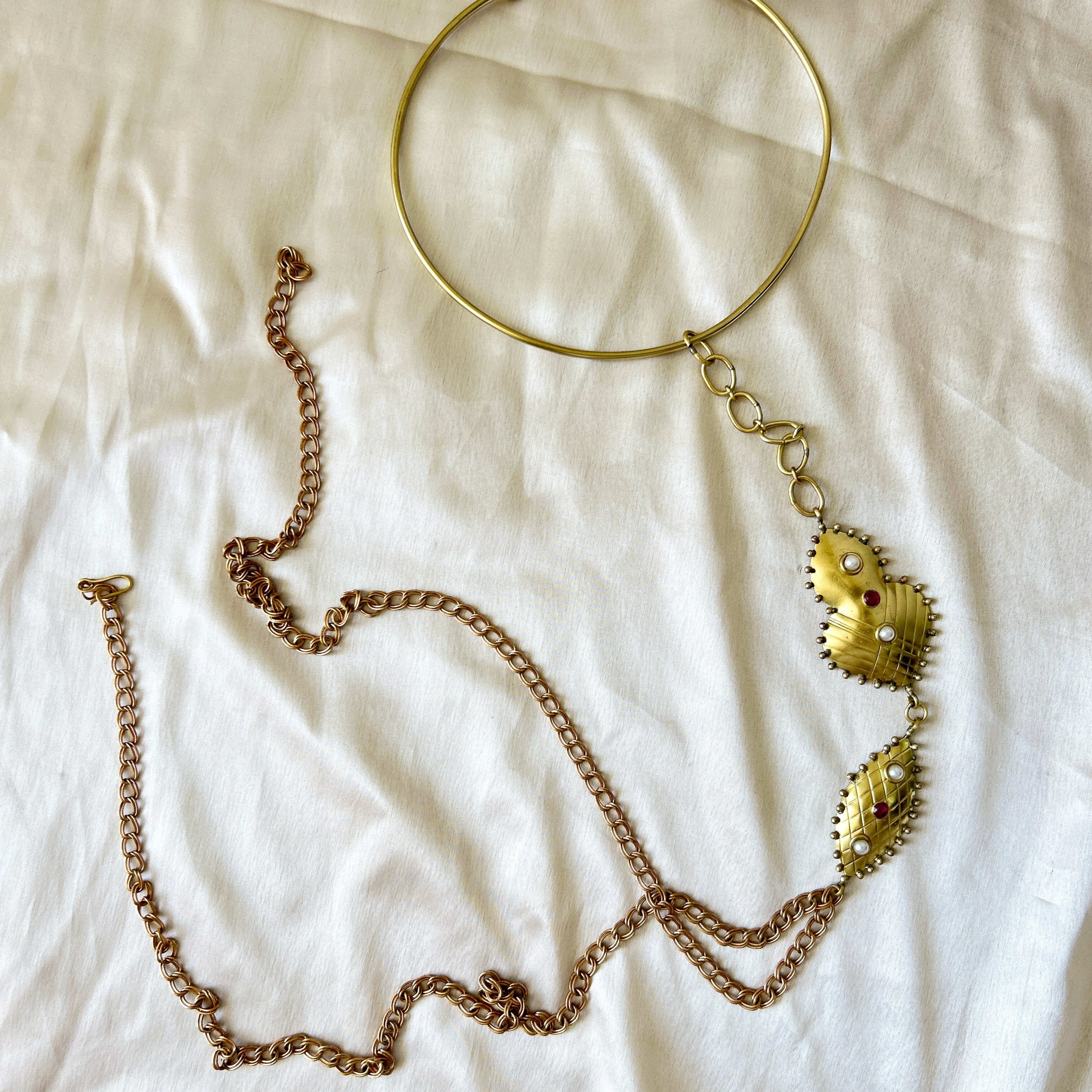 Enhance your look with this stunning body chain, adorned with intricate Indian-inspired patterns adorned with CZ stones and beads. Expertly crafted, the design elegantly hangs from the neck, accentuates the torso, and comfortably fastens with an adjustable chain around the waist. This versatile piece seamlessly combines traditional artistry with modern sophistication, making it perfect for special events, weddings, or adding a touch of luxury to any outfit.