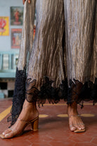 Indulge in luxury with the Devangi Set. Made from pure Banarasi silk tissue, this set features a V-neck top with full sleeves and a side zip for a sleek look. The wide leg pants are ombré dyed and adorned with detailed patchwork and thread embroidery. Complete the look with the half width scarf, crafted with pure banarsi silk and silk organza.