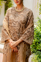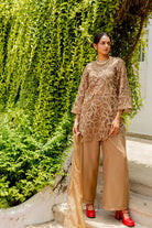 The Kshiti Set is a four-piece ensemble featuring an embroidered and beaded silk top with cutwork details, a sleeveless cotton silk bustier with side zip, comfort-fit silk organza pants, and a half-width scalloped dupatta. Crafted in mocha brown from pure silk Chanderi, silk organza, and cotton-silk blend, this collection offers refined elegance with traditional artistry.