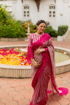 Hot pink saree and blouse set featuring signature patchwork with Resham thread embroidery and cutwork details. Made from pure Chanderi tissue and silk organza, the blouse offers a boxy fit with back closure. Refined craftsmanship meets luxurious fabrics in this elegant ensemble.