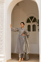 The Nishvi Set is a four-piece ensemble in dark gray and sterling silver. The silk kurta features patchwork with resham embroidery and cutwork details in a boxy fit. It pairs with a relaxed V-neck inner dress in Chanderi tissue, straight-leg Banarasi silk pants with a concealed drawstring, and an embellished dupatta with a scallop hem. Crafted from premium silk blends for understated sophistication.