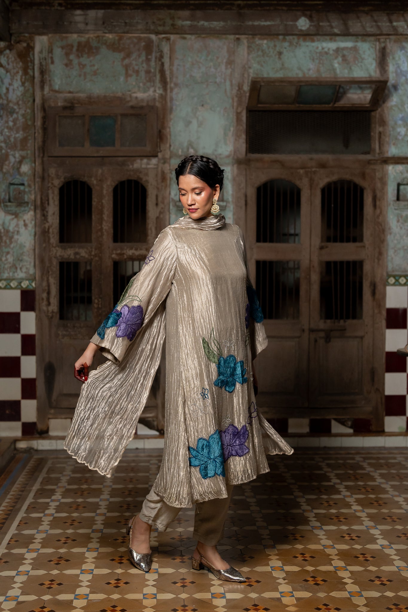 • Dupatta has scalloped hem, thread Embroidery and delicate applique details