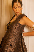 The Vedika Set is a three-piece collection featuring a black and gold embroidered jacket, silk bustier, and high-waisted skirt. Each piece showcases traditional kasab and resham thread work, crafted from pure silk organza and Banarasi silk tissue. Side zip closures and cotton silk linings complete this refined ensemble for special occasions.