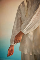 A harmonious blend of structure and softness, the Akai Ito Mandarin Shirt is crafted in striped Chanderi and adorned with intricate appliqué embroidery. The relaxed silhouette is elevated with delicate gathers at the sleeves and a soft box pleat at the back, allowing ease and grace in movement. Designed with a minimal mandarin collar and thoughtful tailoring, it flatters a range of body types with a quiet confidence.