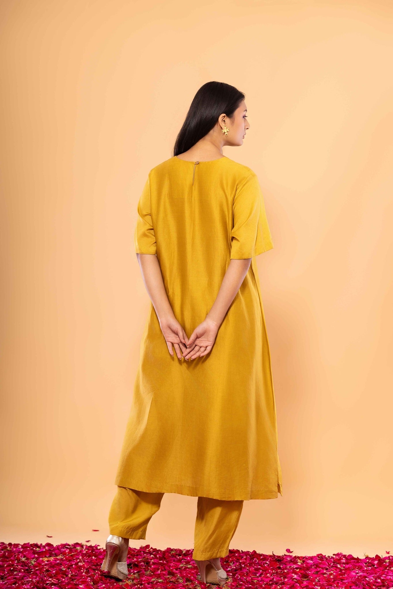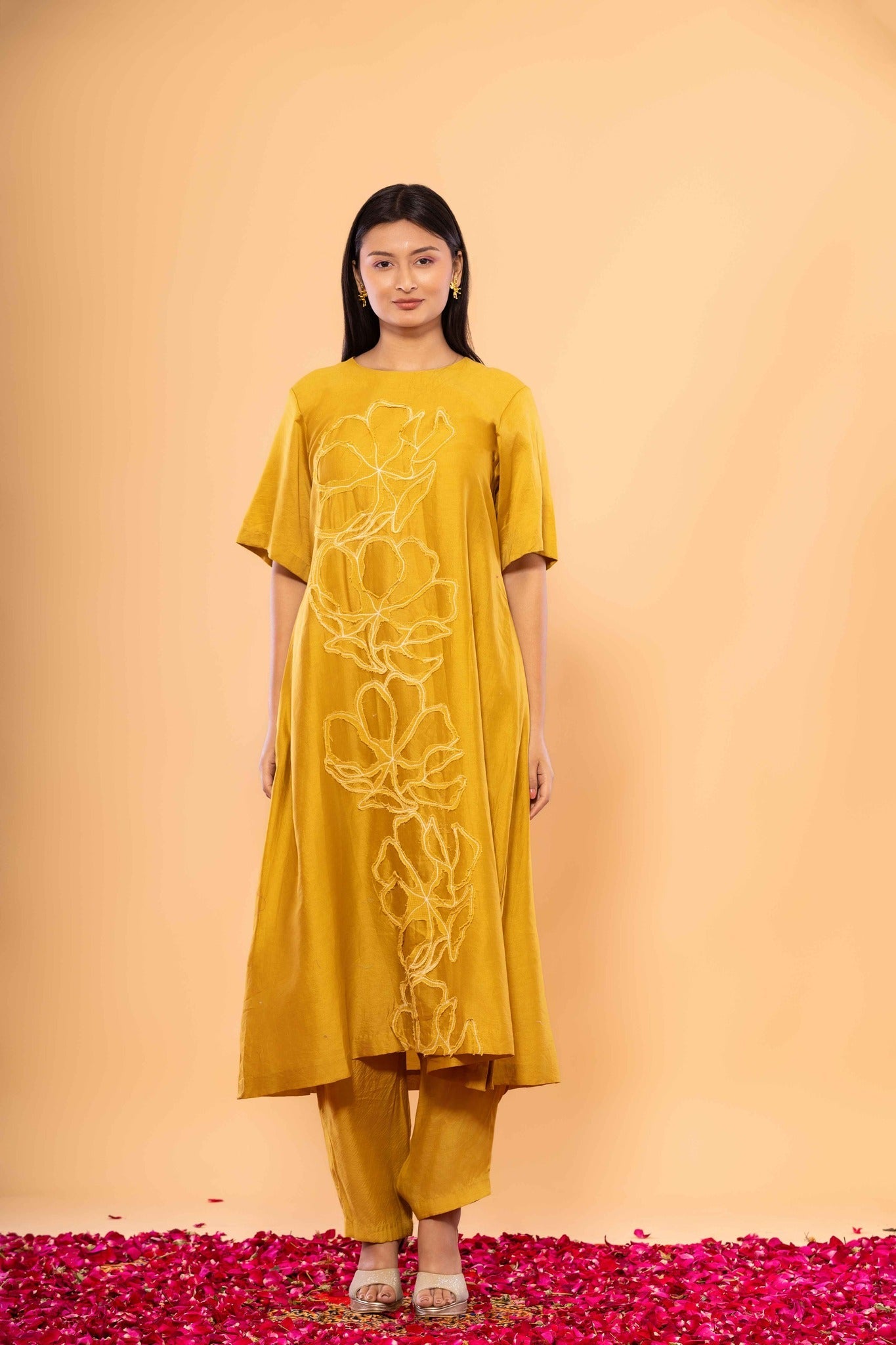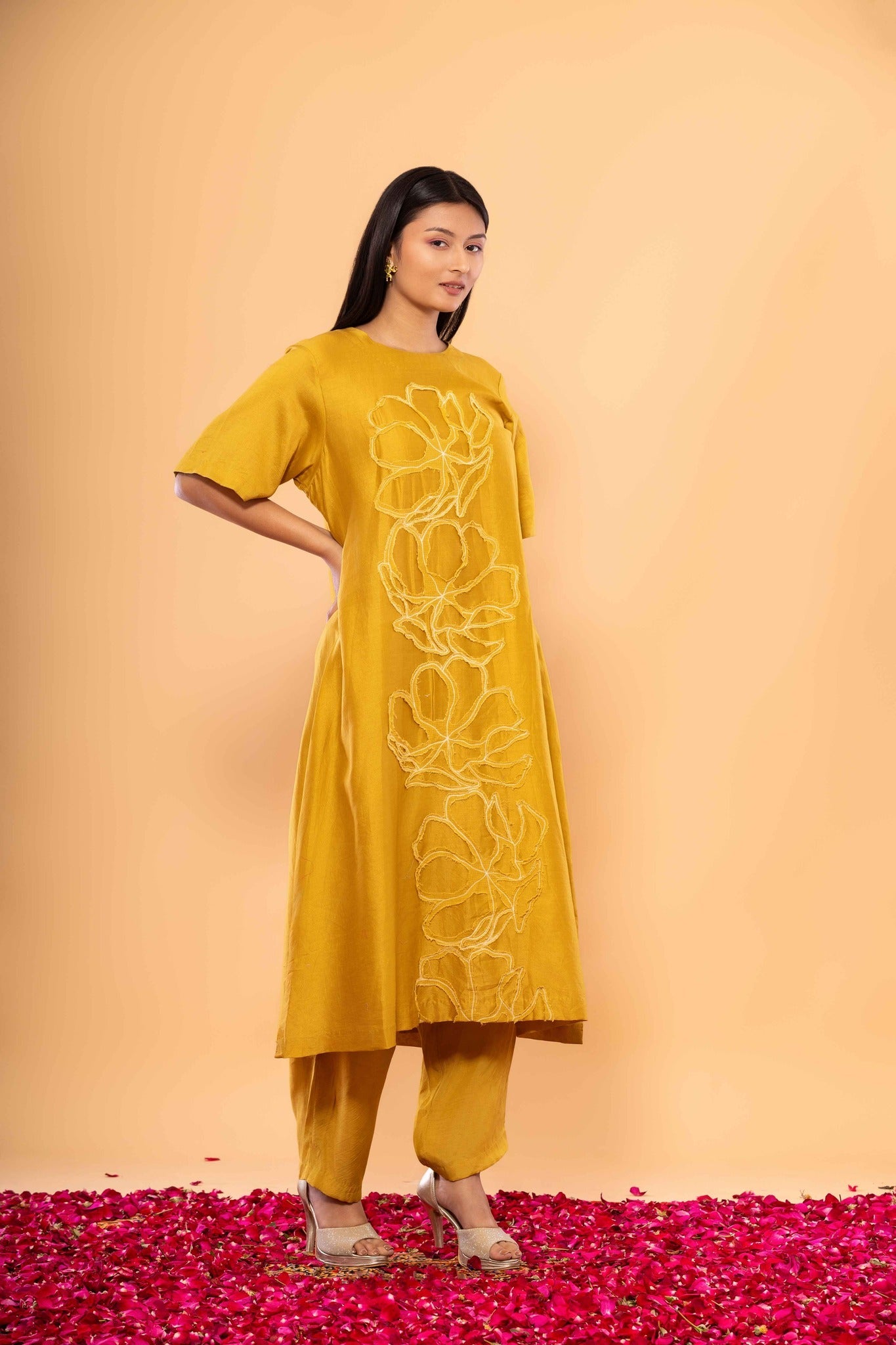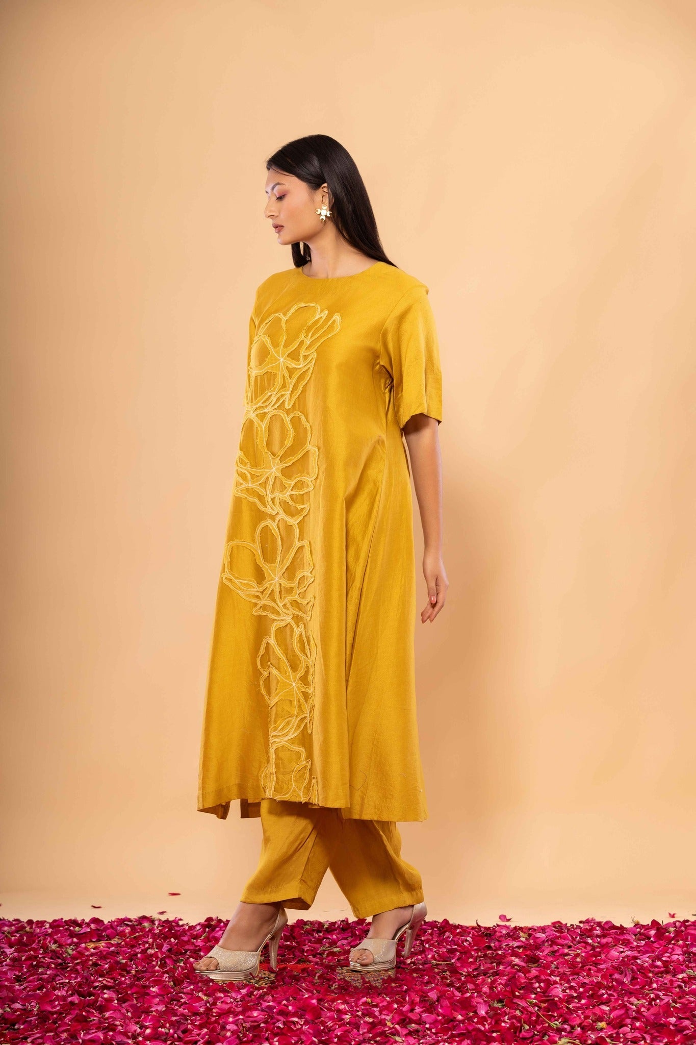 Introducing the Chantal Set, a beautiful and conscious choice for your wardrobe. The Kurta features a round neck and signature floral appliqué with glass beads embroidery, made with handwoven Chanderi Silk for luxurious comfort. The Pants are made with pure all-weather silk and have an elasticated back and concealed drawstring for a perfect fit. Ethically and elegantly made.