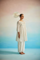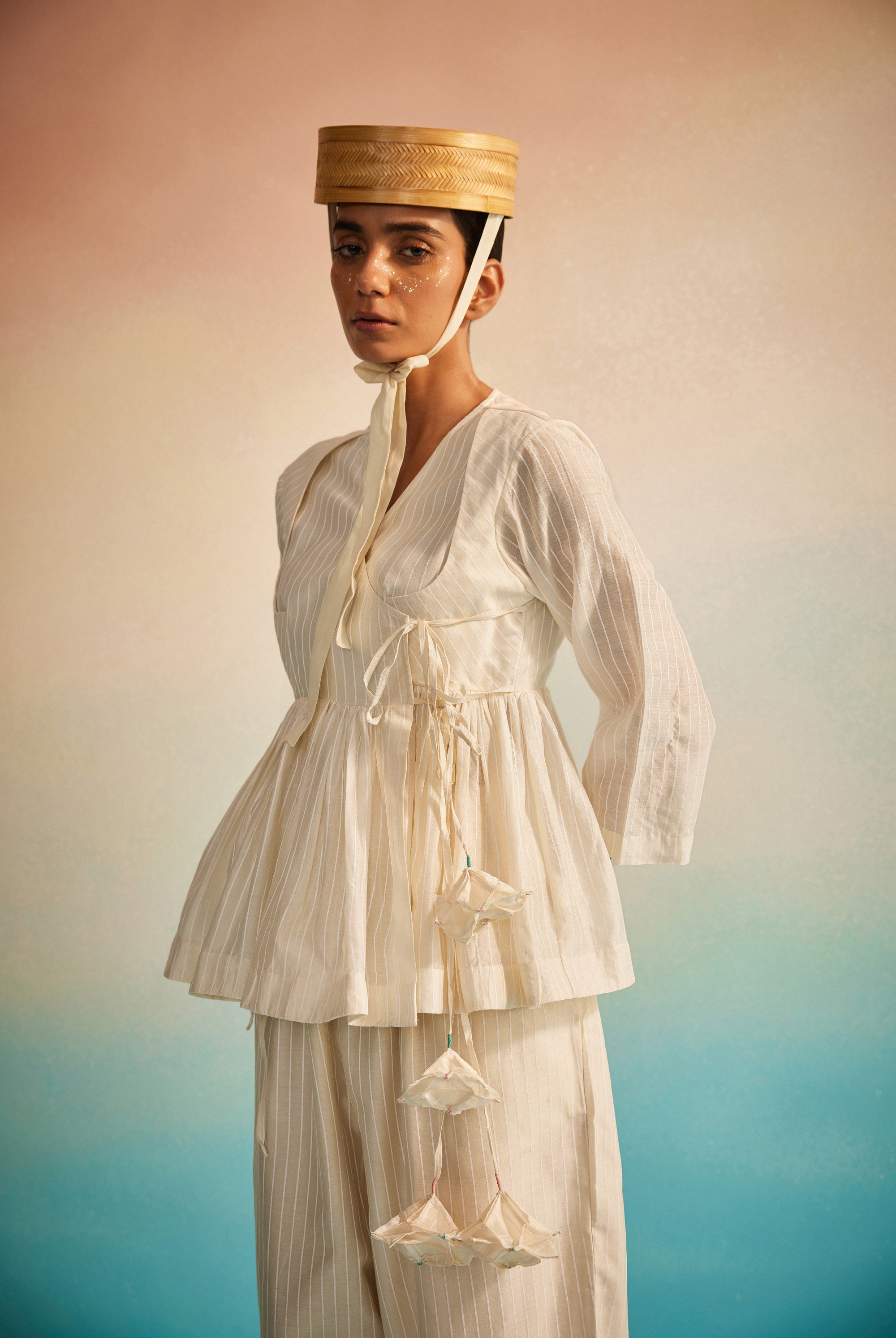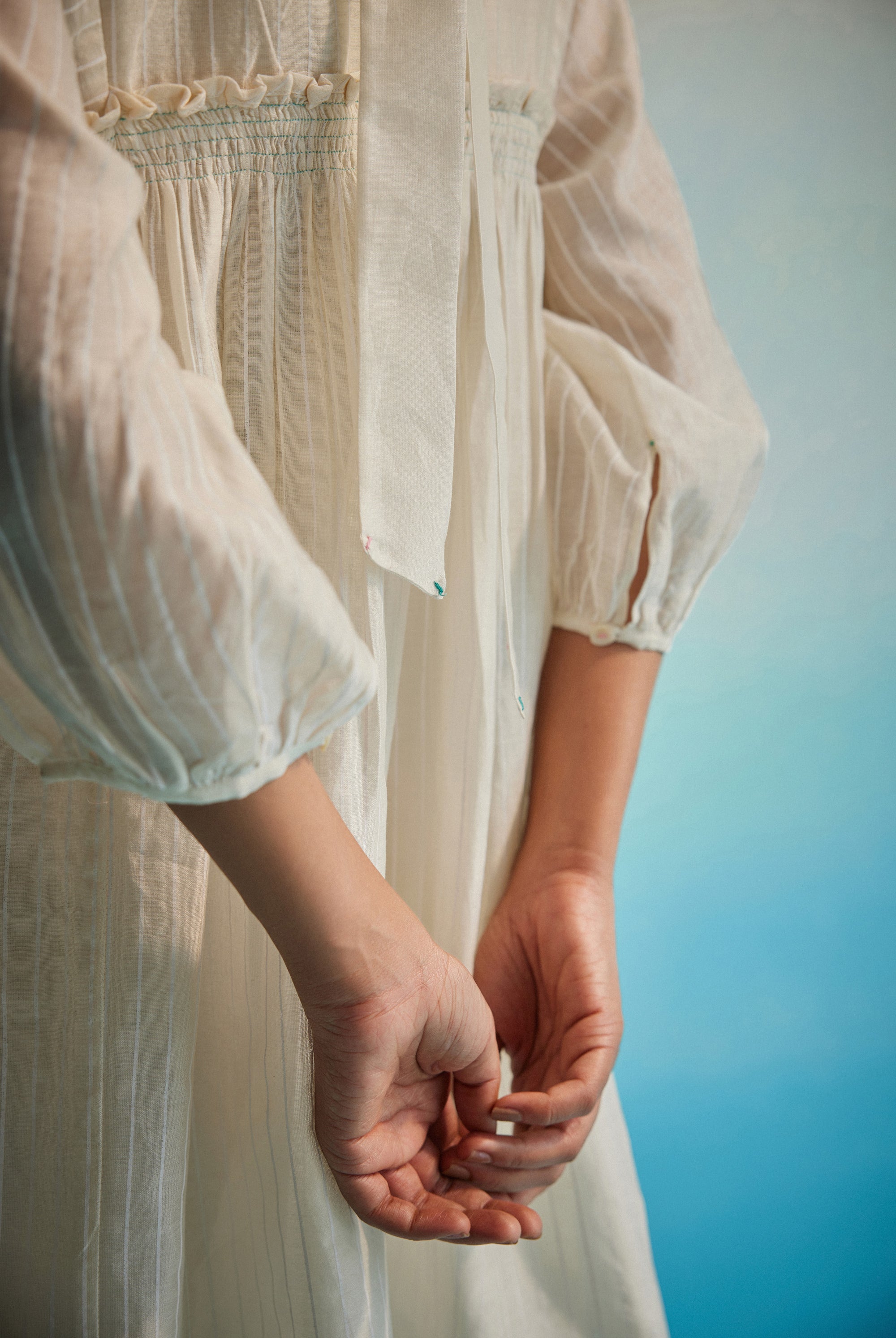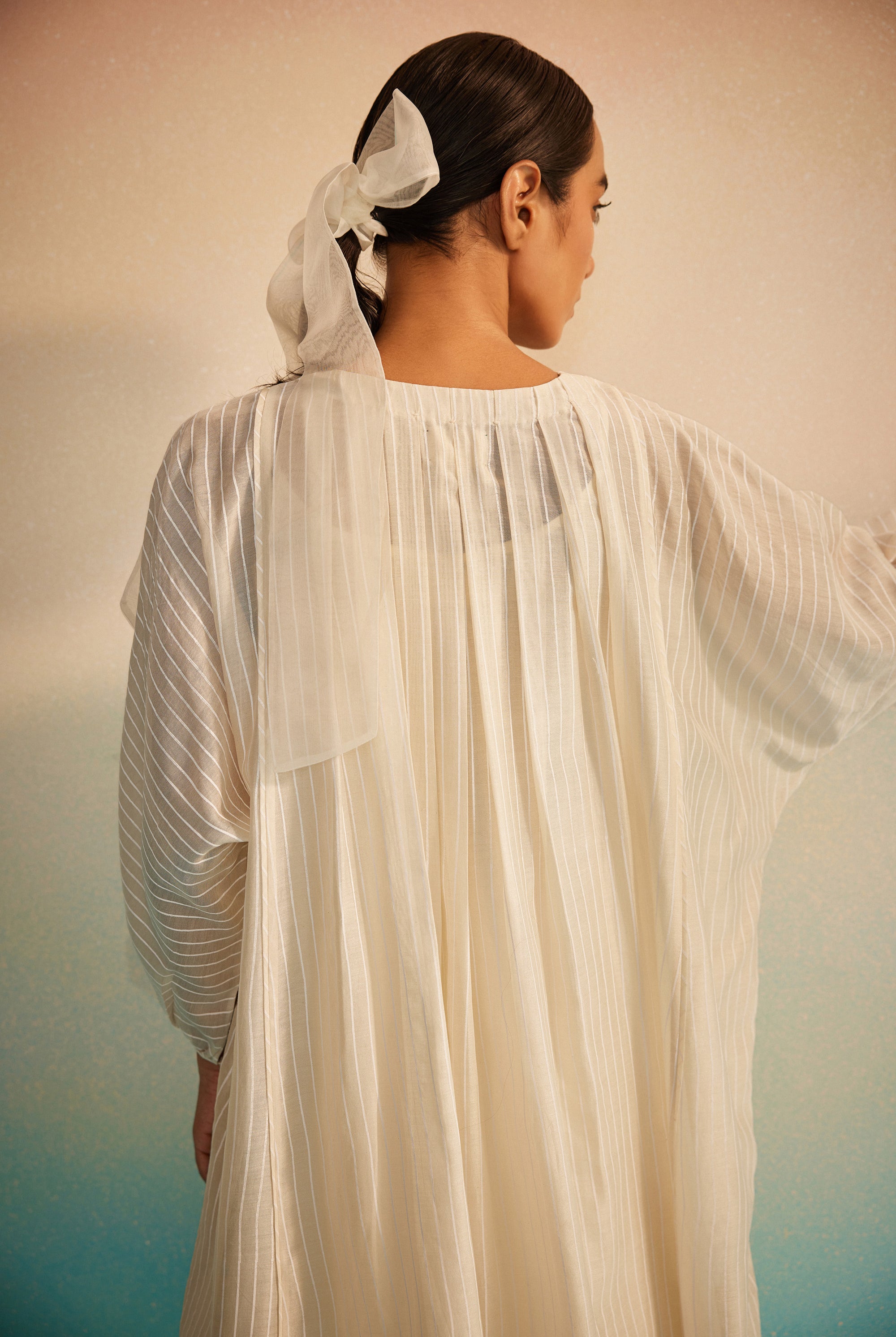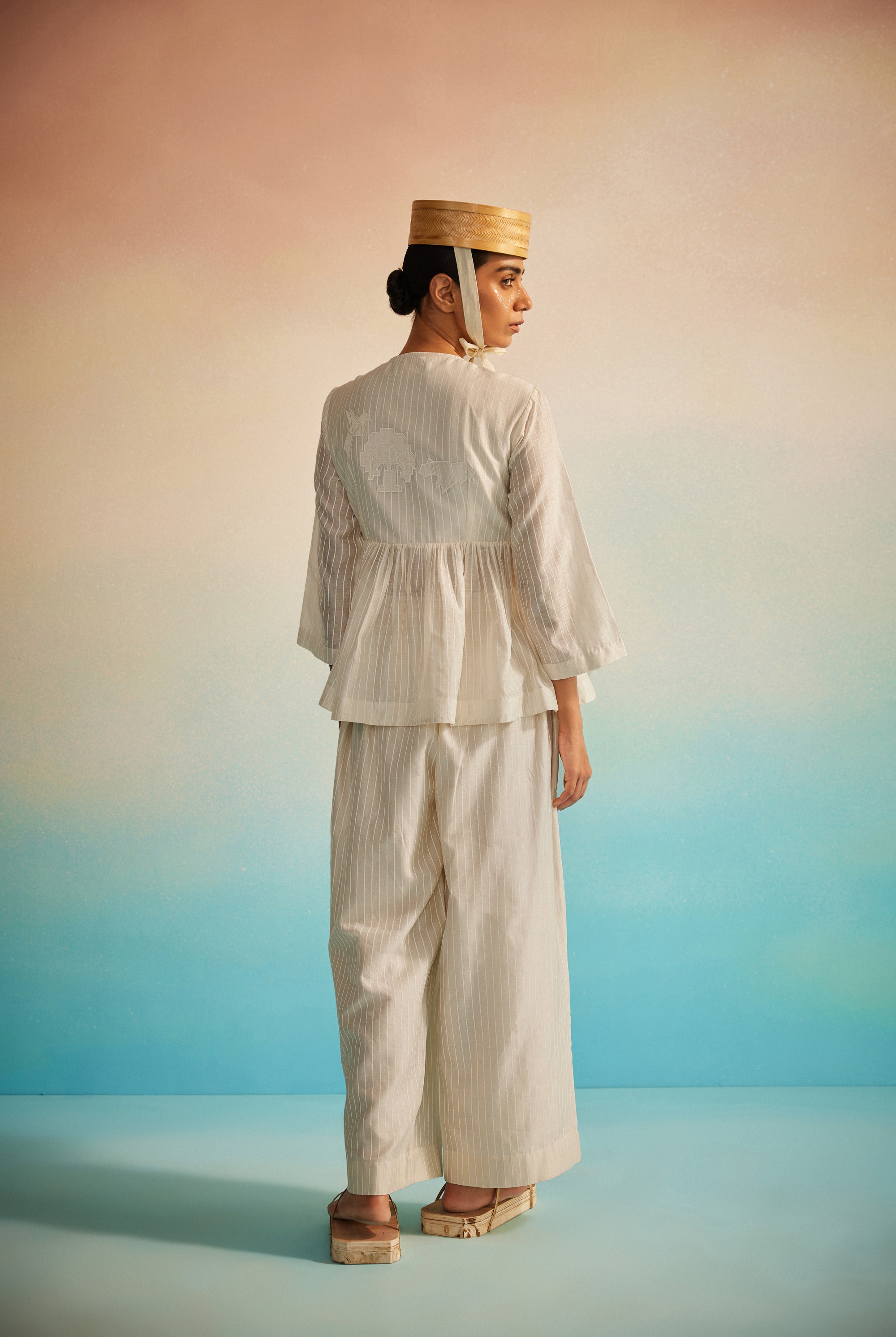 Light as a whisper, the Hakanai Yoke Top is crafted in striped hand screenprinted Chanderi, offering a perfect balance of softness and structure. The delicately embroidered yoke anchors the piece, while gentle ruching along the style lines add dimension and ease. A piece that blends comfort with quiet craftsmanship — Hakanai Yoke Top is made to be worn with ease, again and again.