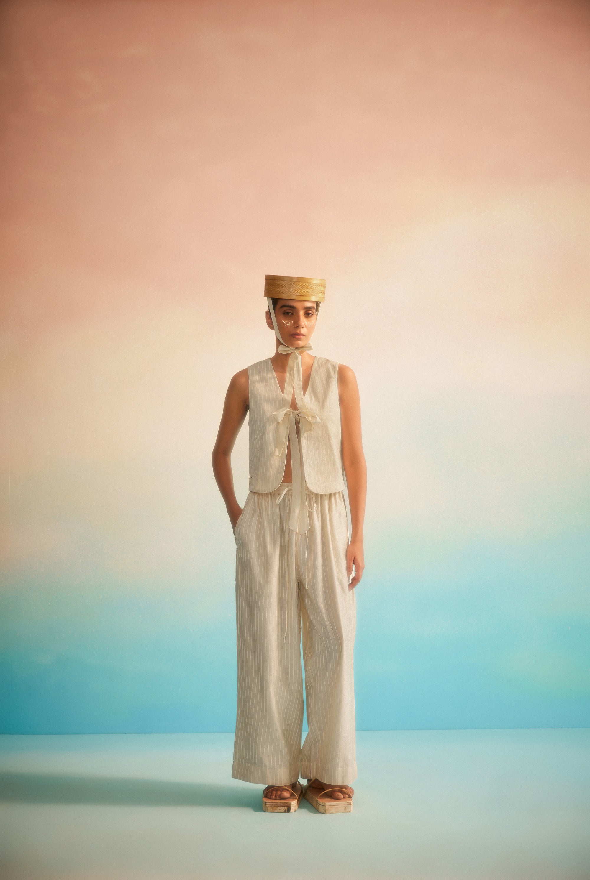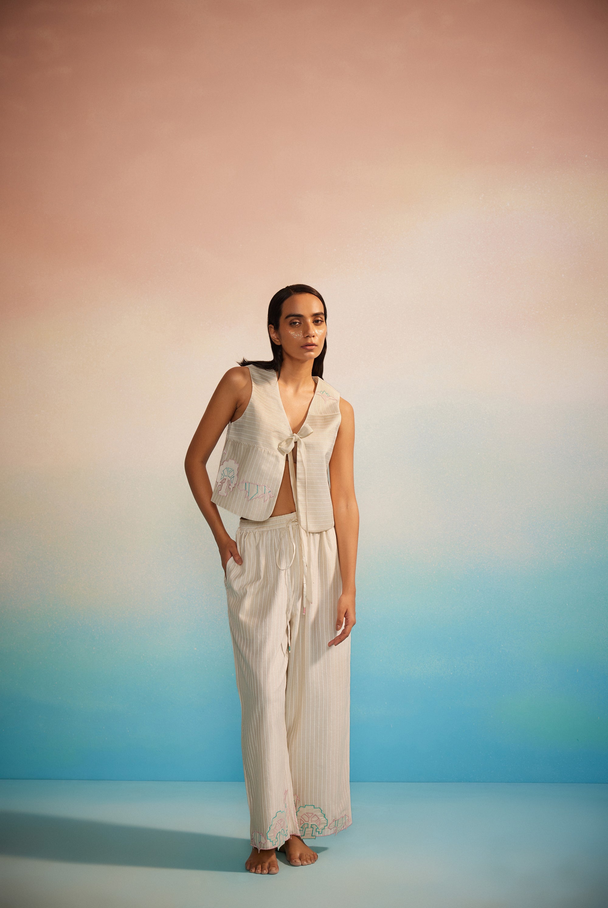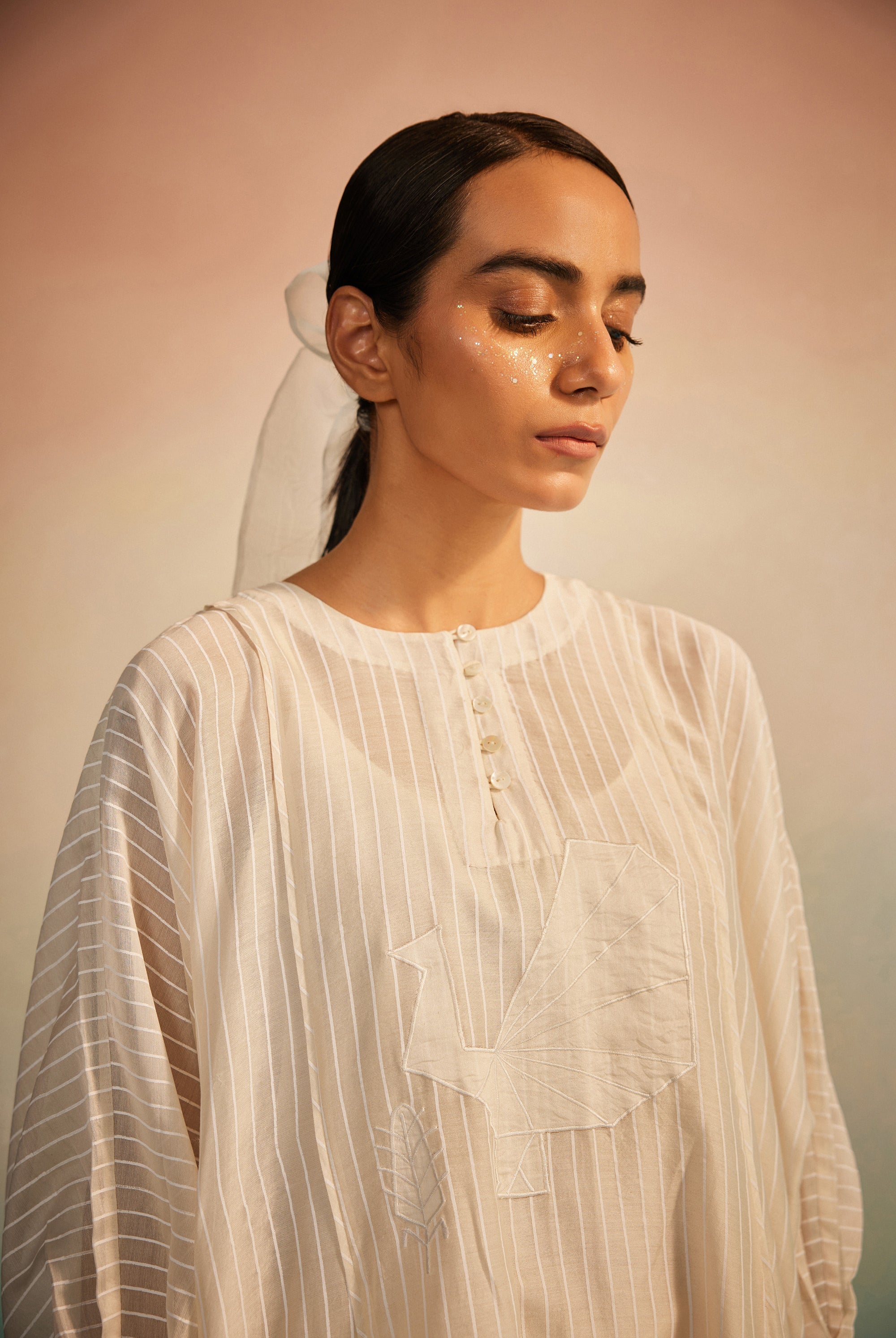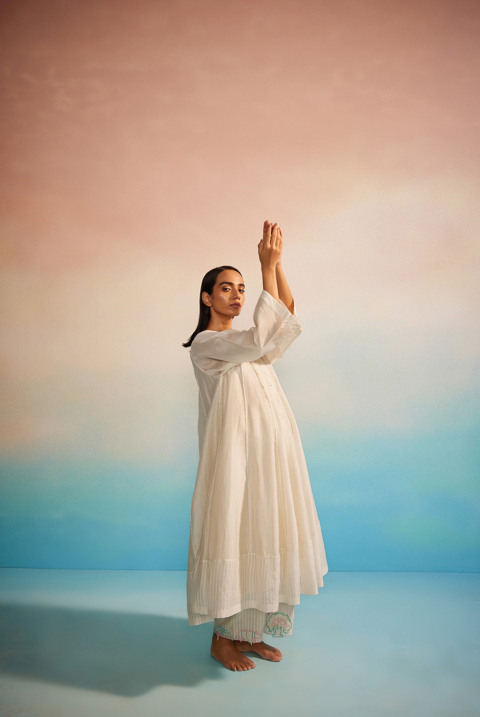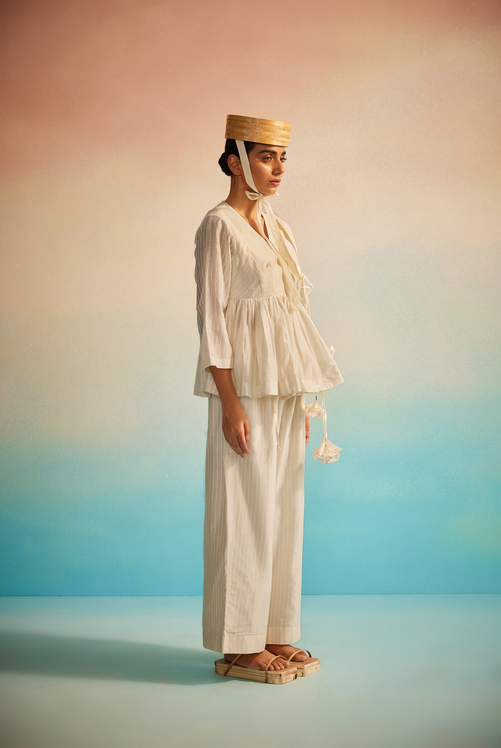 Light as a whisper, the Hakanai Yoke Top is crafted in striped hand screenprinted Chanderi, offering a perfect balance of softness and structure. The delicately embroidered yoke anchors the piece, while gentle ruching along the style lines add dimension and ease. A piece that blends comfort with quiet craftsmanship — Hakanai Yoke Top is made to be worn with ease, again and again.