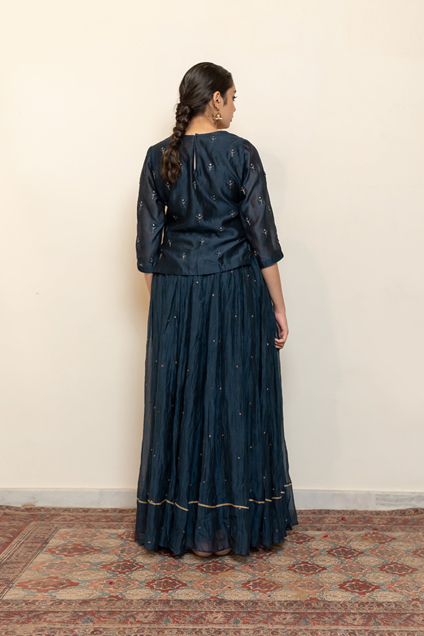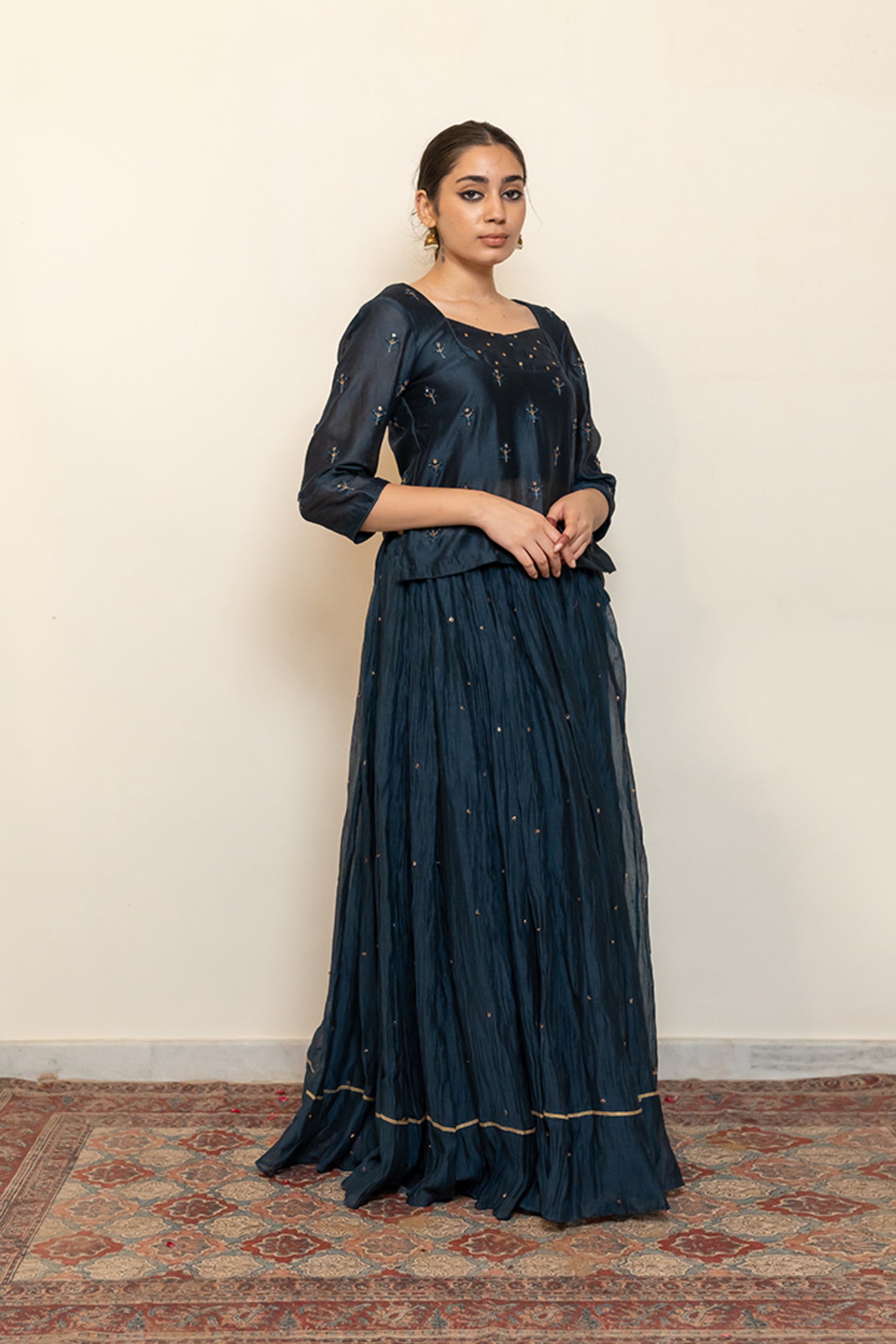 Heer lehenga set inspired from the traditional Rajput poshak featuring long blouse hand embroidered with resham motifs paired with gathered lehenga.
