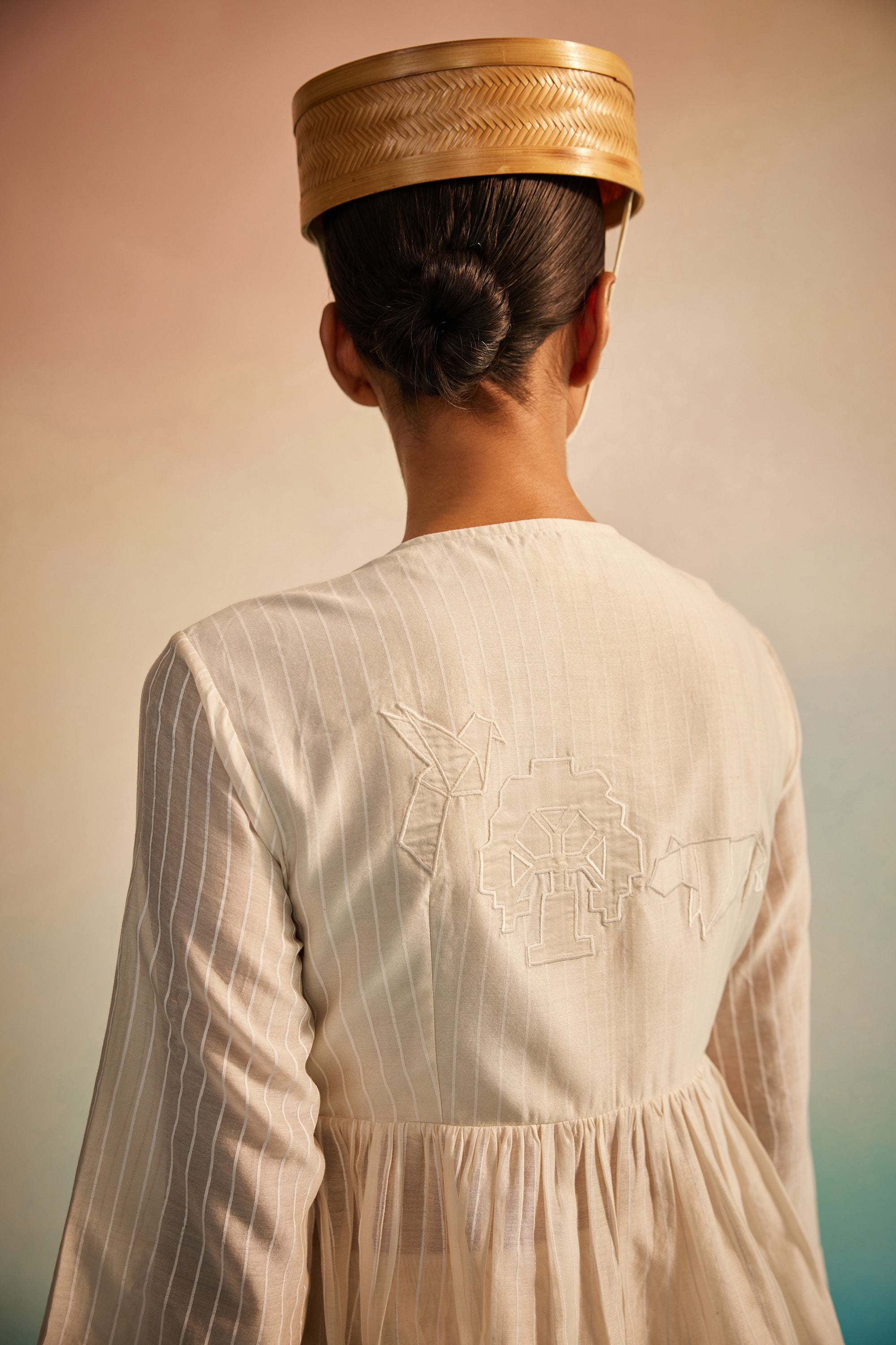 A contemporary take on a classic silhouette, the Tabaneru Angrakhi is crafted in hand screenprinted Chanderi. The Angrakhi is elevated with an intricately appliqué yoke at the back and delicate 3D origami flowers at the tieups — adding a playful yet refined charm. Its lightness and detailing make it perfect for both everyday elegance and thoughtful occasion dressing.