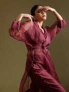 A crop top layered with an organza jacket detailed with minimal embellishments on the collar and cuffs, paired with pants featuring side beaded floral embroidery, finished with a belt for a complete look.