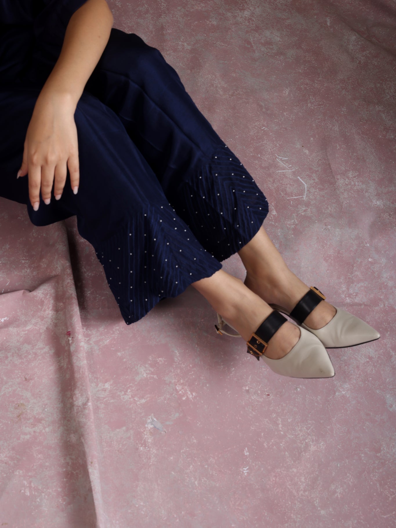 High-low top with pleated straight-fit pants. V-neck, highlighted with delicate embroidery on the neckline and pant hem — minimal, comfortable, yet festive.