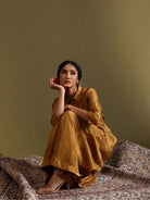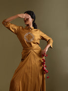 A silk shirt with zari thread embroidery and a statement button, paired with a draped skirt, the sheen of silk adding a subtle festive edge. Comes with an Inner.