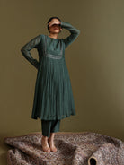 A gathered kurta and pencil fit pants with a keyhole neckline, highlighted by zari and resham thread embroidery, sequins, and delicate embellishments on the yoke. Comes with an Inner.