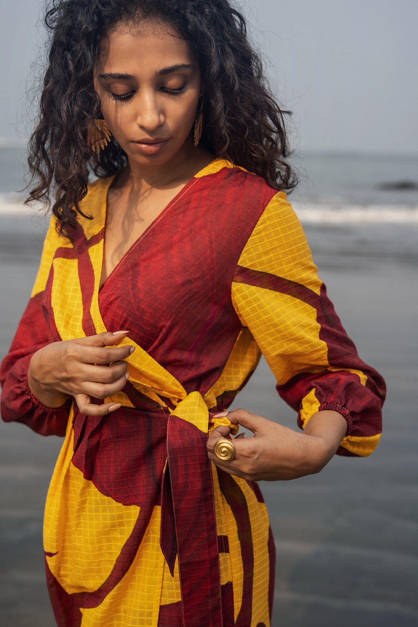 - Dress has V neck with tie-up detailing on sides, and balloon sleeves