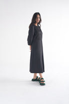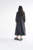 This Black Soot Dress is crafted from soft cotton modal, featuring a pleated texture across the bodice that adds depth and elegance. Its standout sleeve details enhance the sophisticated design, making it a refined choice for a polished and stylish look.