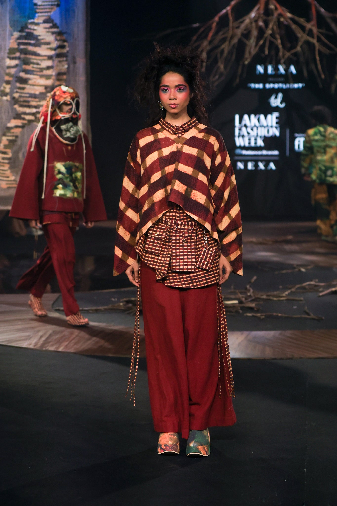 This plaid cape top, crafted from handspun cotton, offers a relaxed and oversized silhouette with meticulous tailoring and refined finishing. Its sophisticated design combines comfort with elegance, making it a versatile addition to your wardrobe.