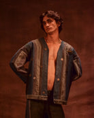Our Circle Jacket is an outer layer that features sculpted denim panels cut and sewn with innovative pattern‑making to achieve its circular silhouette. The sleeves curve in from the top seam, giving shape without any boning. Metal coins adorn the body for vintage flair. A standout piece that elevates any outfit with edge and artistry.