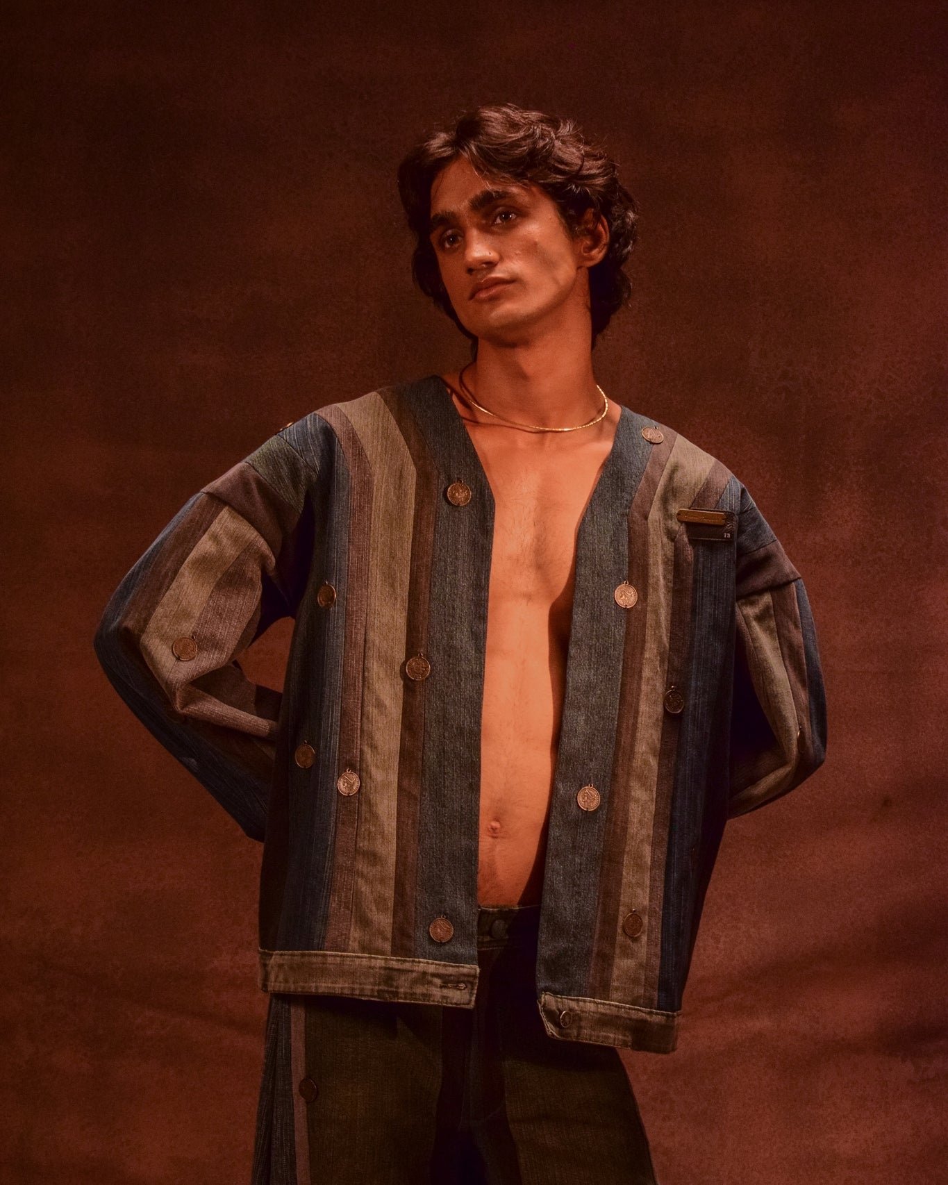 Anam Husain’s collection reimagines Rajasthan’s Kathputlis to explore patriarchy through caged silhouettes, puppet-like geometry, and grainy, eroded textures. Crafted from 1000 kg of repurposed denim and discarded furnishings, it becomes a quiet study of decay, memory, and reinvention.