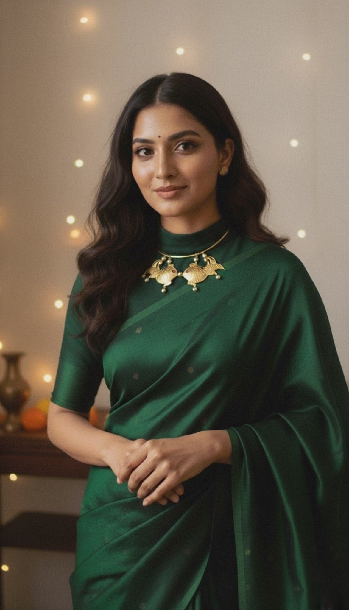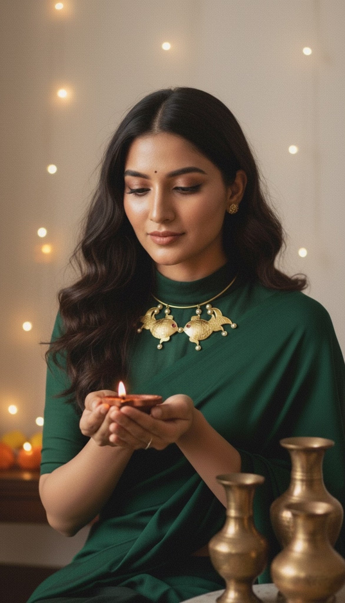 For admirers of fish, this intricately designed hasli necklace offers a harmonious blend of tradition and contemporary style. Its delicate craftsmanship and shimmering stone embellishments make it an ideal accessory for sarees, Indian attire, or any festive ensemble.