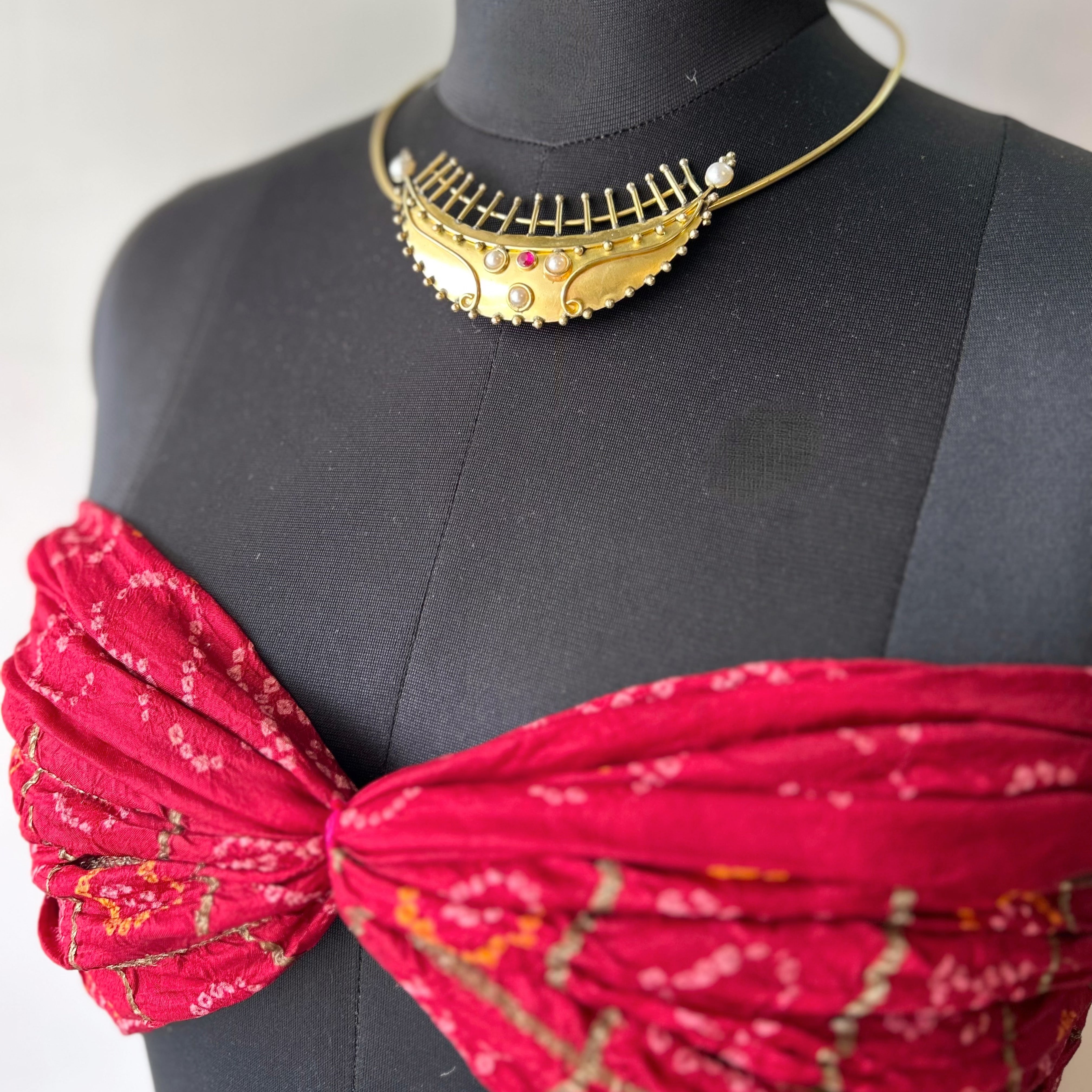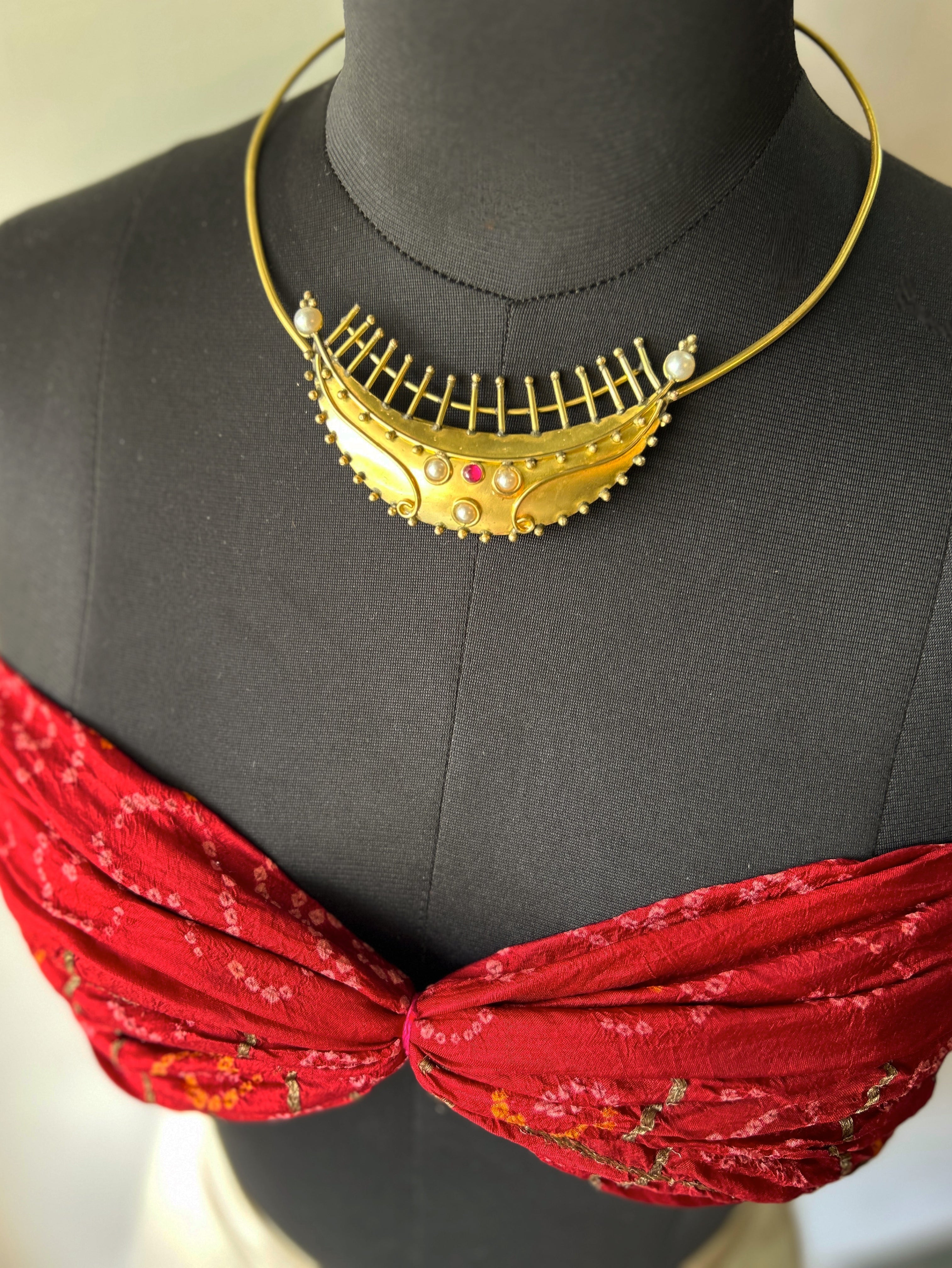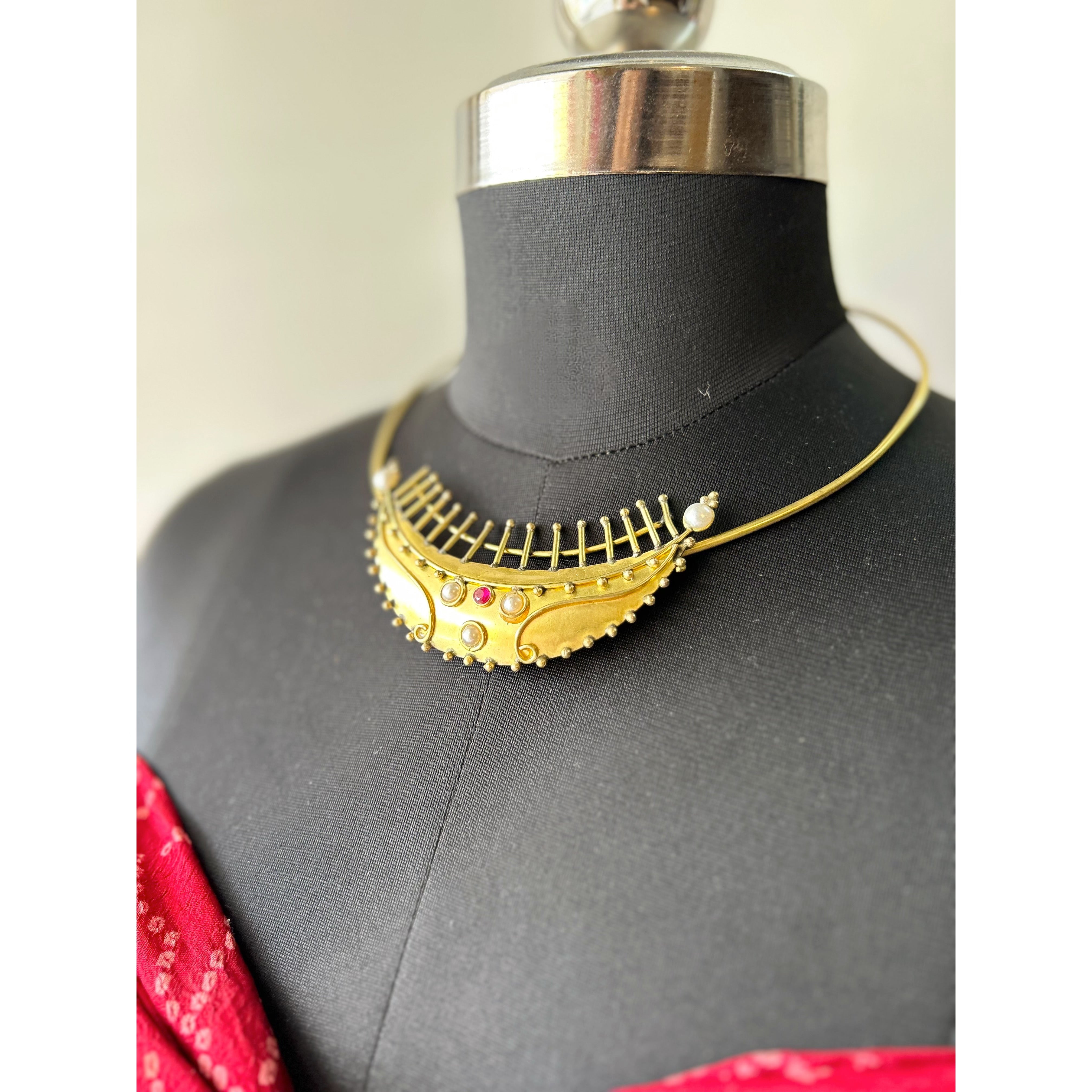 For admirers of moon elegance, this intricately designed hasli necklace offers a harmonious blend of tradition and contemporary style. Its delicate craftsmanship and shimmering stone embellishments make it an ideal accessory for sarees, Indian attire, or any festive ensemble.