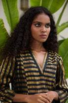 Indulge in luxury with our Kalakriti Set, featuring a V neck kalidaar kurta and black chanderi trousers made from our hand woven gold zari striped chanderi fabric. Elevate your style and stand out in this exclusive and sophisticated ensemble.