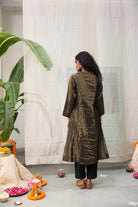 Indulge in luxury with our Kalakriti set. Hand-crafted in our exclusive gold zari striped chanderi fabric, this set features a V-neck kalidaar kurta and black chanderi trousers. Elevate your style with sophistication.