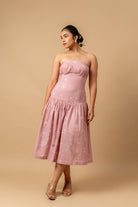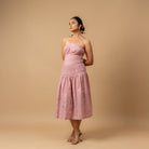 This elegant tube dress features a front yoke and a drop waist, complemented by a back zipper and subtle elastic detailing for a tailored fit. Crafted from naturally dyed bandhani cotton, it combines traditional artistry with refined style.