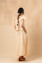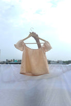 This short mega sleeve summer crop top features an off-shoulder design adorned with randomly placed doodle embroidery. Crafted from organic cotton and hand-dyed using azo-free colors, it offers a refined and eco-conscious style.