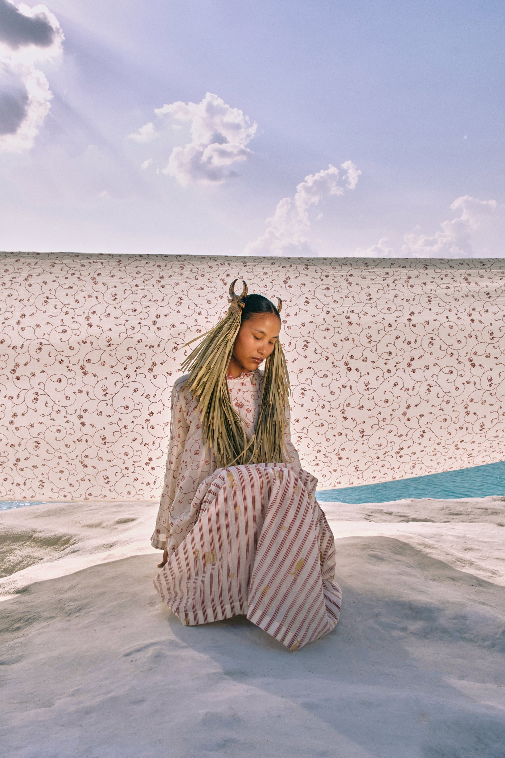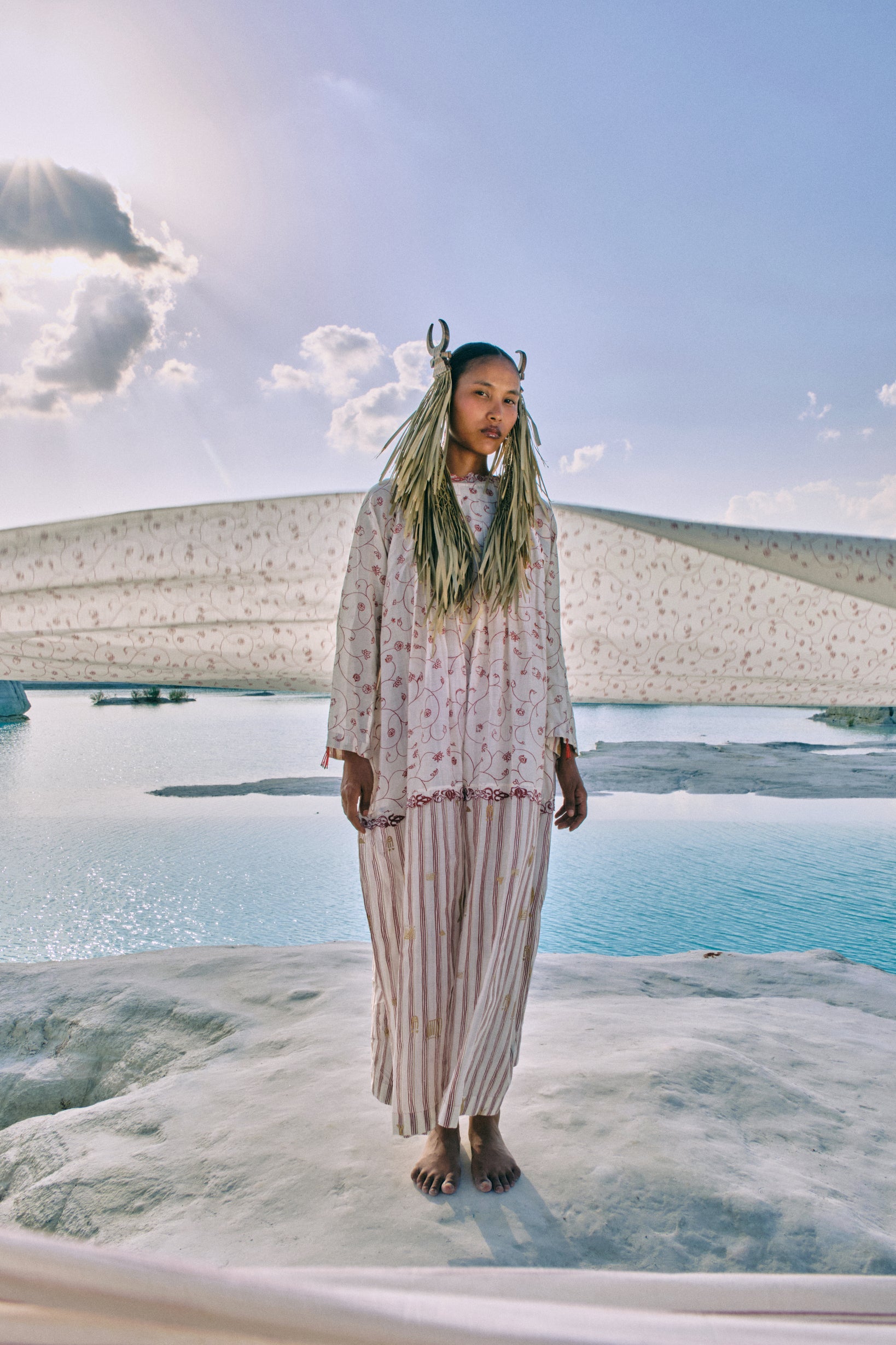 The Chan Box Pleat Dress exemplifies architectural elegance through its deliberate construction and artisanal details. Contrasting hand-screen-printed cotton silk provides visual depth, while precisely executed box pleats at the yoke establish refined structure. Embroidered lace frames the neckline with grace, raglan sleeves with bias binding offer soft definition, and a back tie-up crowned with handmade beaded tassels delivers a final touch of understated luxury.