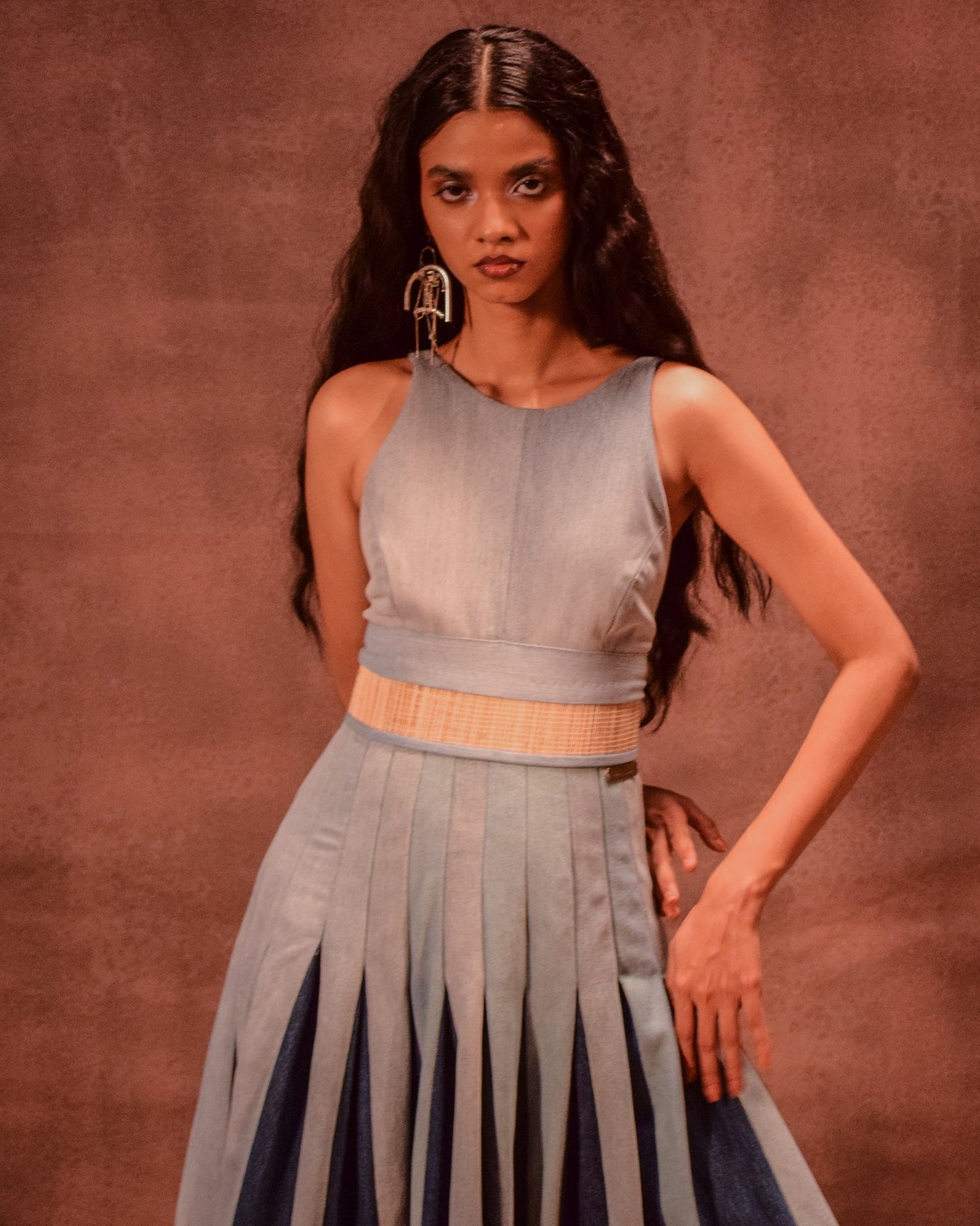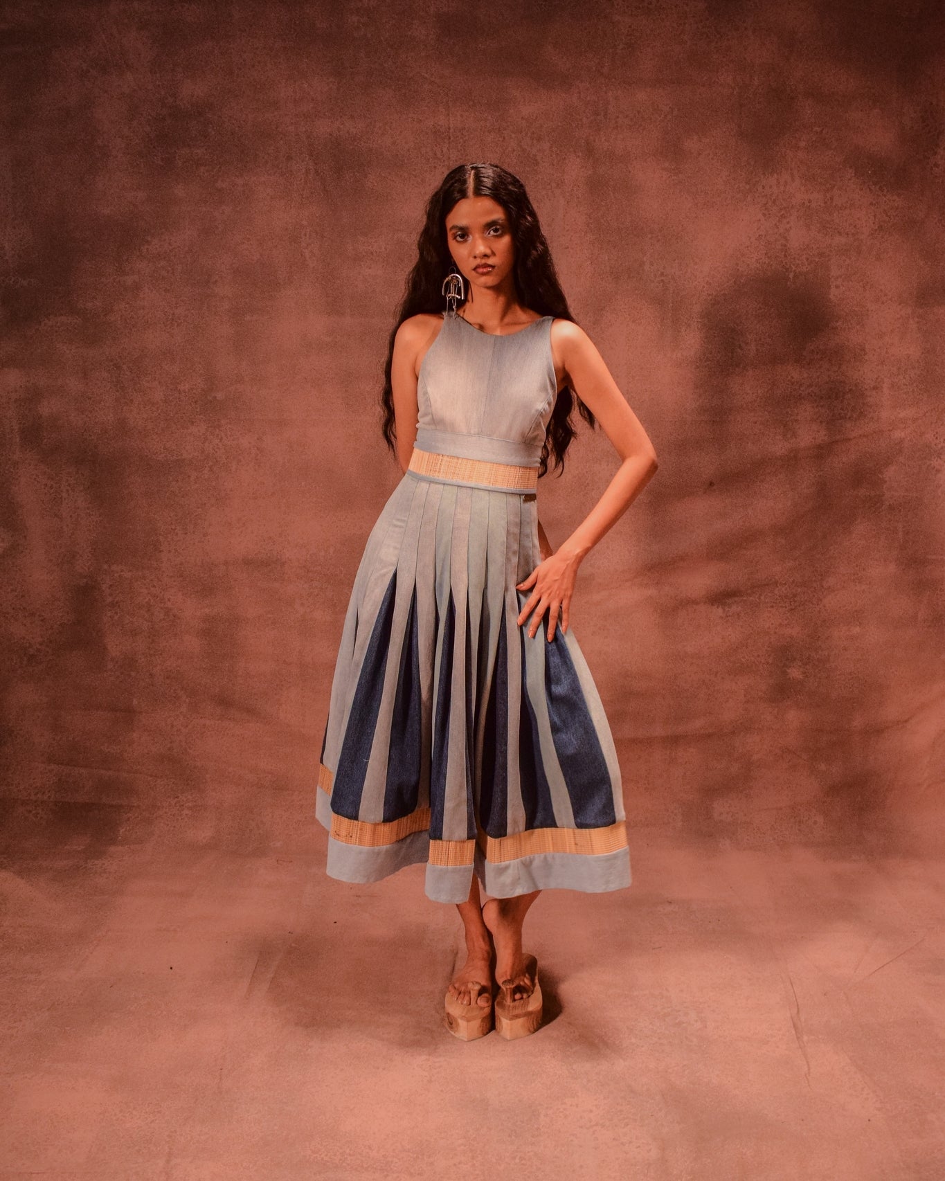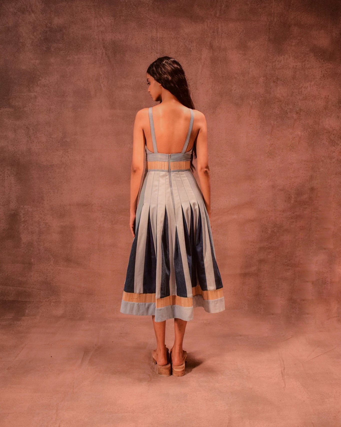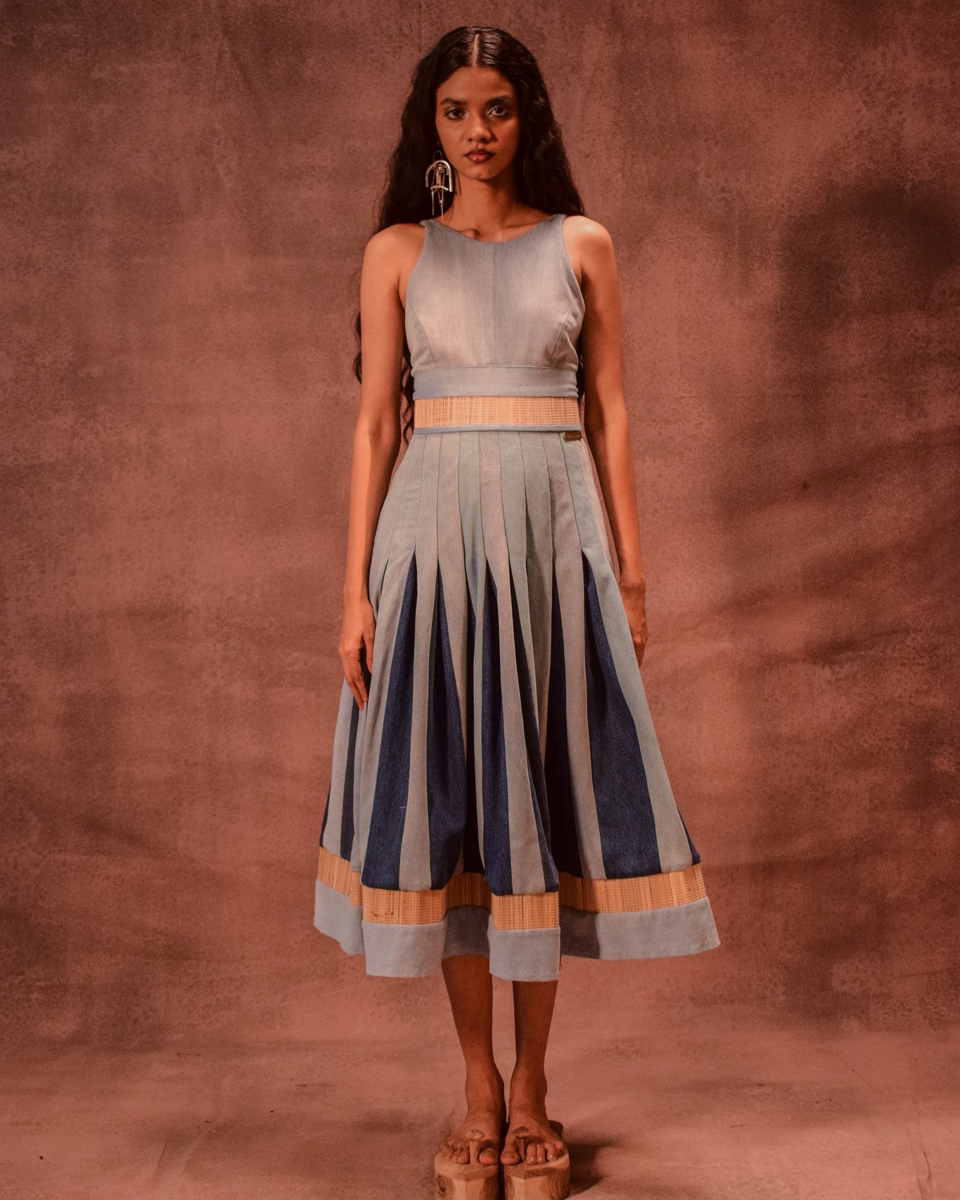 Crafted with a unique Chatai bamboo weave, this dress blends traditional texture with contemporary design. Featuring bold color-blocked godet panels that add volume and movement, it’s both structured and fluid. The halter neckline is complemented by sleek straps, while a concealed back zipper ensures a cinched, flattering silhouette at the waist.