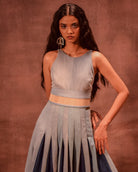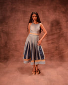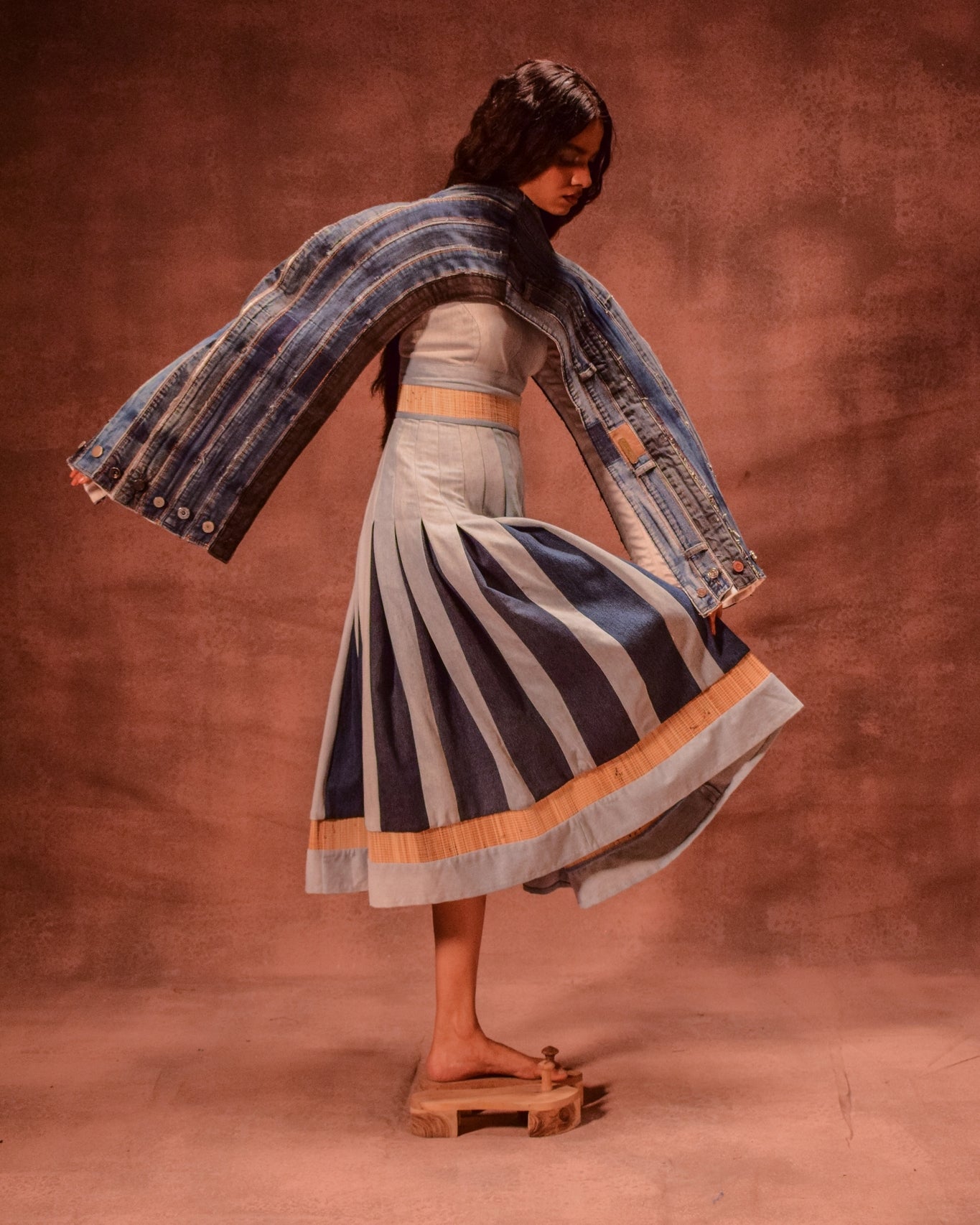 Anam Husain’s collection reimagines Rajasthan’s Kathputlis to explore patriarchy through caged silhouettes, puppet-like geometry, and grainy, eroded textures. Crafted from 1000 kg of repurposed denim and discarded furnishings, it becomes a quiet study of decay, memory, and reinvention.